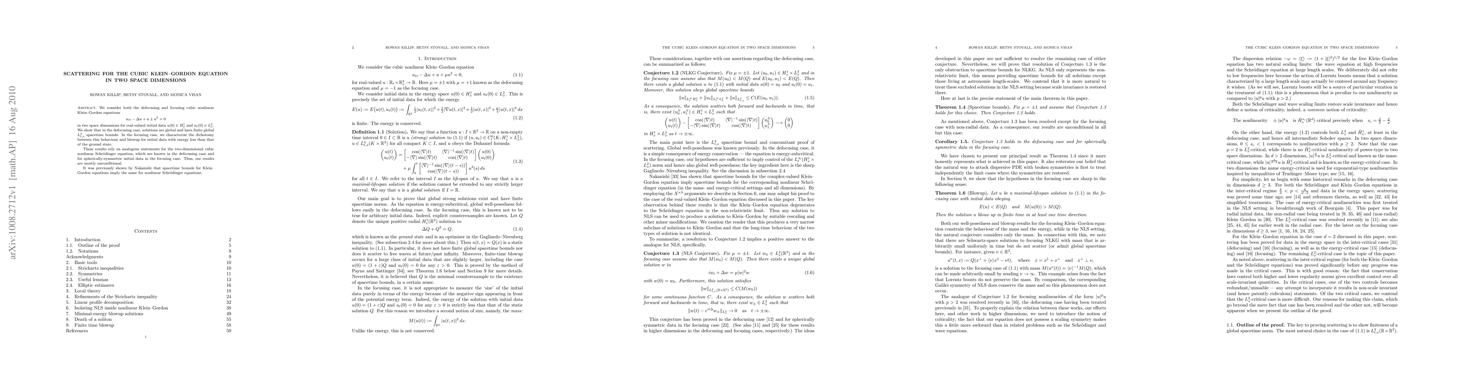 This paper investigates the scattering behavior of the cubic nonlinear Klein-Gordon equation in two dimensions, proving global existence and finite spacetime bounds for defocusing cases, and characterizing the dichotomy between scattering and blowup for focusing cases with subcritical energy. The results build on known properties of the cubic nonlinear Schrödinger equation.