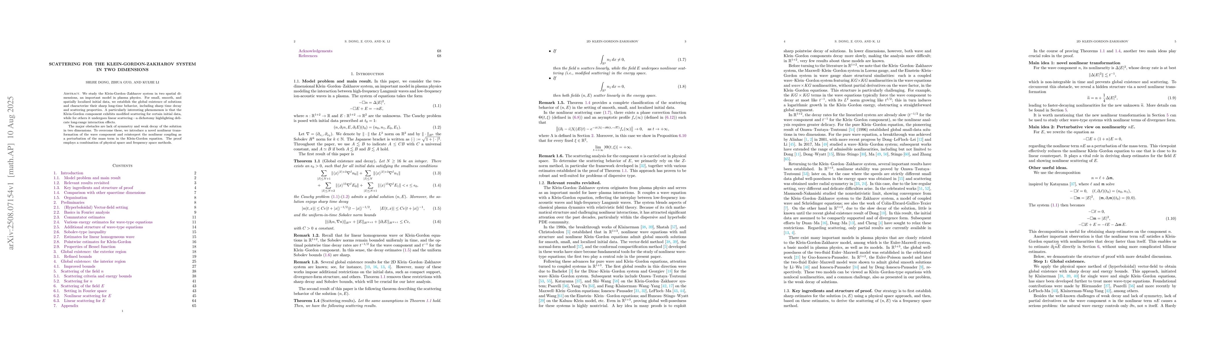 We study the Klein-Gordon-Zakharov system in two spatial dimensions, an important model in plasma physics. For small, smooth, and spatially localized initial data, we establish the global existence of solutions and characterize their sharp long-time behavior, including sharp time decay and scattering properties. A particularly interesting phenomenon is that the Klein-Gordon component exhibits modified scattering for certain initial data, while for others it undergoes linear scattering-a dichotomy highlighting delicate long-range interaction effects. The major obstacles are lack of symmetry and weak decay of the solution in two dimensions. To overcome these, we introduce a novel nonlinear transformation of the wave component and reinterpret the nonlinear coupling as a perturbation of the mass term in the Klein-Gordon equation. The proof employs a combination of physical space and frequency space methods.
