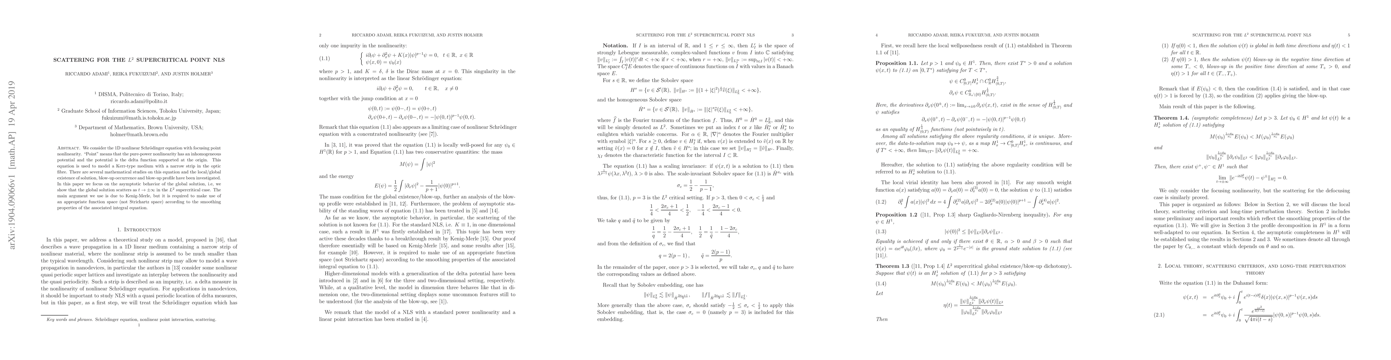 We consider the 1D nonlinear Schr\"odinger equation with focusing point nonlinearity. "Point" means that the pure-power nonlinearity has an inhomogeneous potential and the potential is the delta function supported at the origin. This equation is used to model a Kerr-type medium with a narrow strip in the optic fibre. There are several mathematical studies on this equation and the local/global existence of solution, blow-up occurrence and blow-up profile have been investigated. In this paper we focus on the asymptotic behavior of the global solution, i.e, we show that the global solution scatters as t tends to minus/plus infinity in the $L^2$ supercritical case. The main argument we use is due to Kenig-Merle, but it is required to make use of an appropriate function space (not Strichartz space) according to the smoothing properties of the associated integral equation.