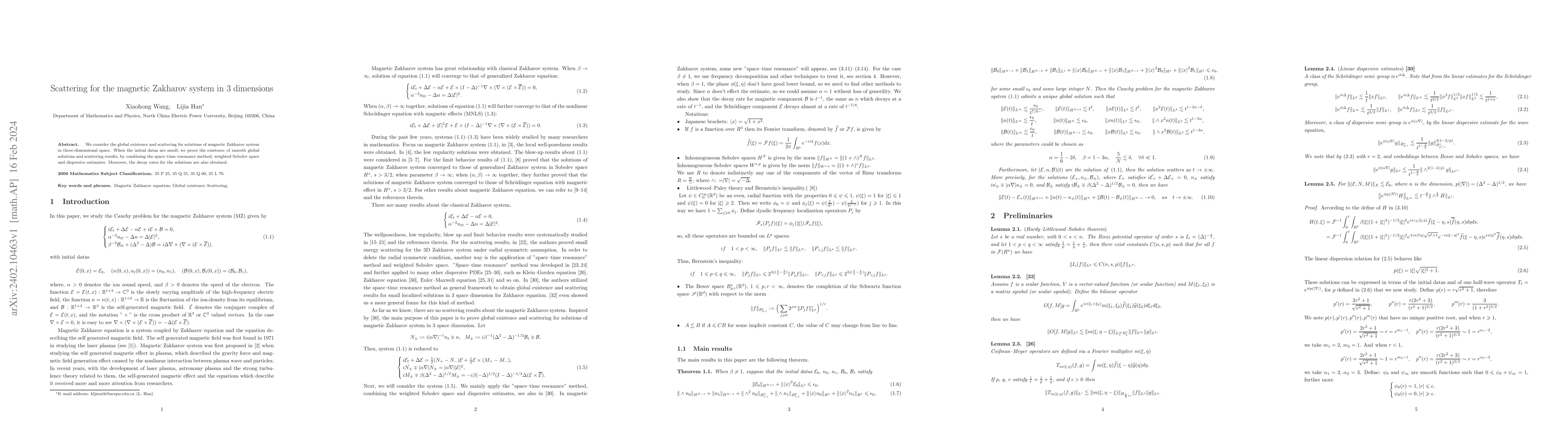 This paper proves global existence and scattering for the magnetic Zakharov system in three dimensions when initial data is small. The authors utilize a combination of the space-time resonance method, weighted Sobolev spaces, and dispersive estimates to achieve these results, along with obtaining decay rates for the solutions.
