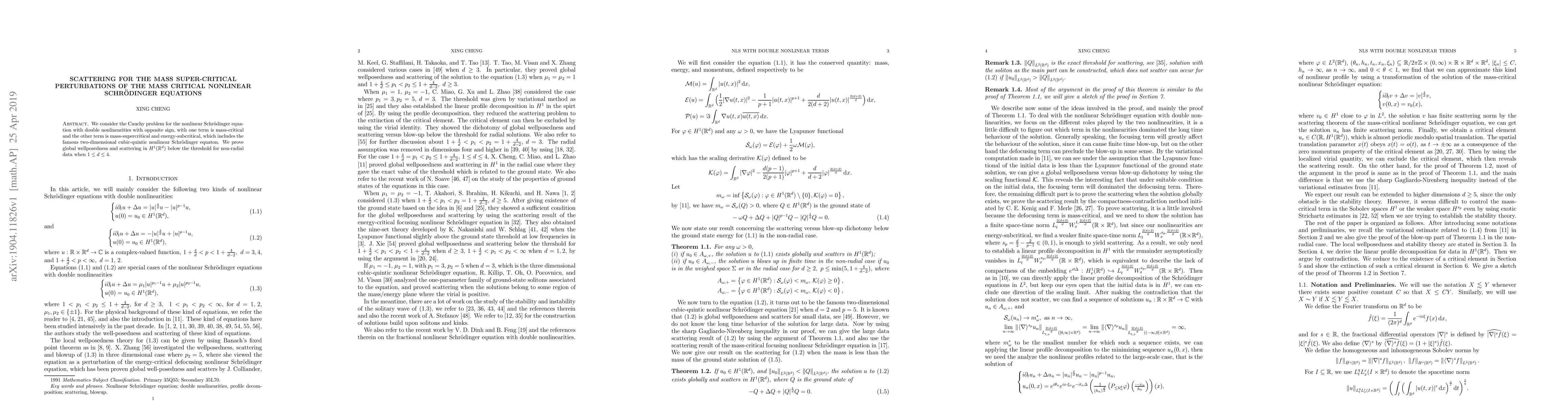 This paper investigates the Cauchy problem for a mass super-critical nonlinear Schrödinger equation with a mass-critical and a mass-supercritical term. The authors prove global wellposedness and scattering in $H^1(\mathbb{R}^d)$ for $1 \le d \le 4$ when the data is non-radial.