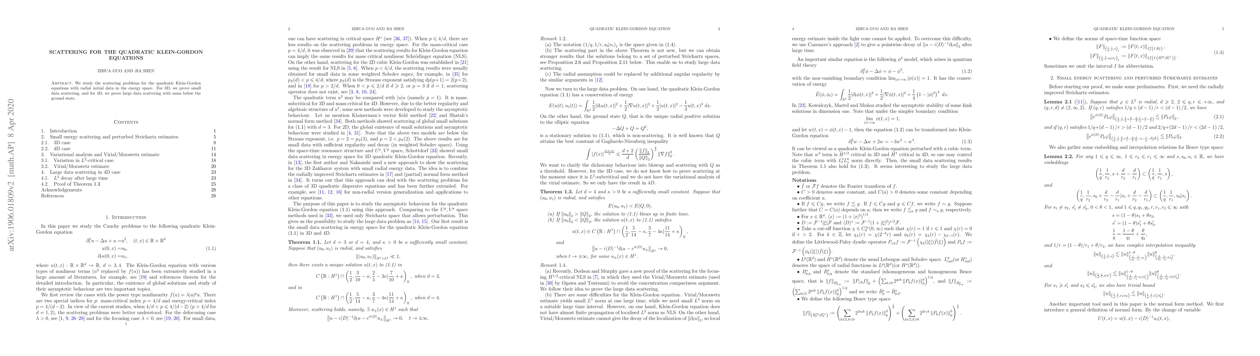 Summary: This paper investigates scattering behavior for quadratic Klein-Gordon equations in dimensions 3 and 4, proving small data scattering in 3D and large data scattering in 4D for masses below the ground state.