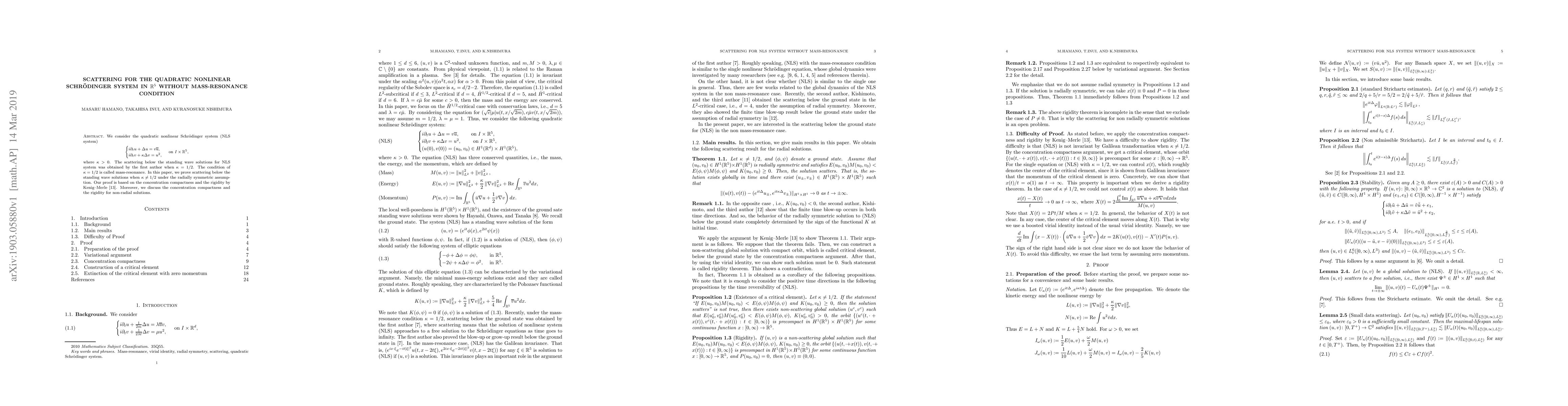 We consider the quadratic nonlinear Schr\"{o}dinger system (NLS system) \begin{align*}\begin{cases} i\partial_t u + \Delta u = v \overline{u}, \\ i\partial_t v+\kappa \Delta v = u^2, \end{cases} \text{ on } I \times \mathbb{R}^5, \end{align*} where $\kappa>0$. The scattering below the standing wave solutions for NLS system was obtained by the first author when $\kappa = 1/2$. The condition of $\kappa=1/2$ is called mass-resonance. In this paper, we prove scattering below the standing wave solutions when $\kappa \neq 1/2$ under the radially symmetric assumption. Our proof is based on the concentration compactness and the rigidity by Kenig--Merle. Moreover, we discuss the concentration compactness and the rigidity for non-radial solutions.