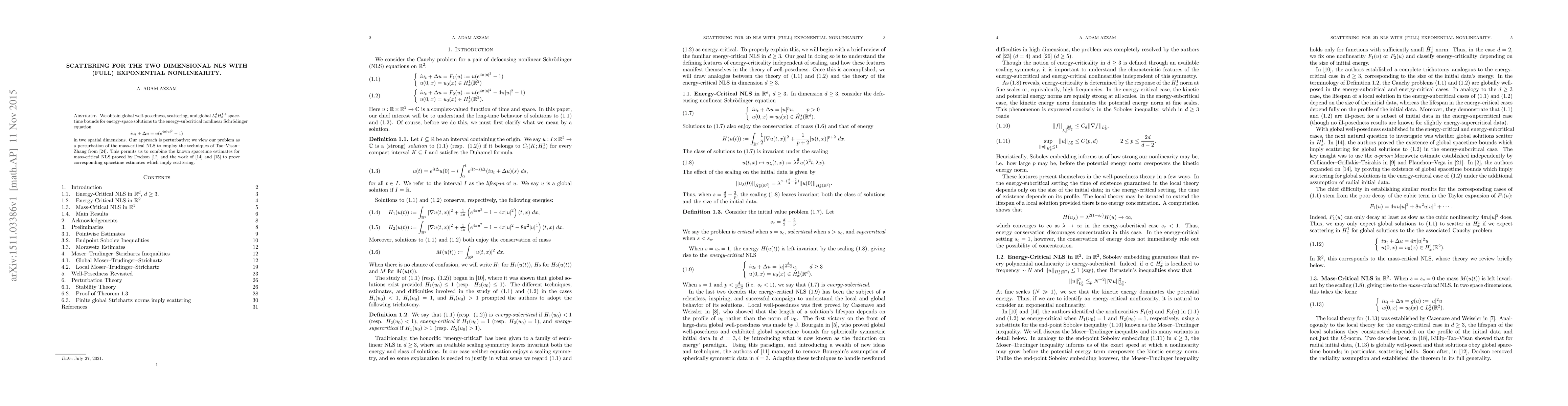 This paper establishes global well-posedness and scattering for the two-dimensional energy-subcritical nonlinear Schrödinger equation with exponential nonlinearity. The authors use a perturbative approach, leveraging techniques from mass-critical NLS and related work to derive spacetime bounds that imply scattering.