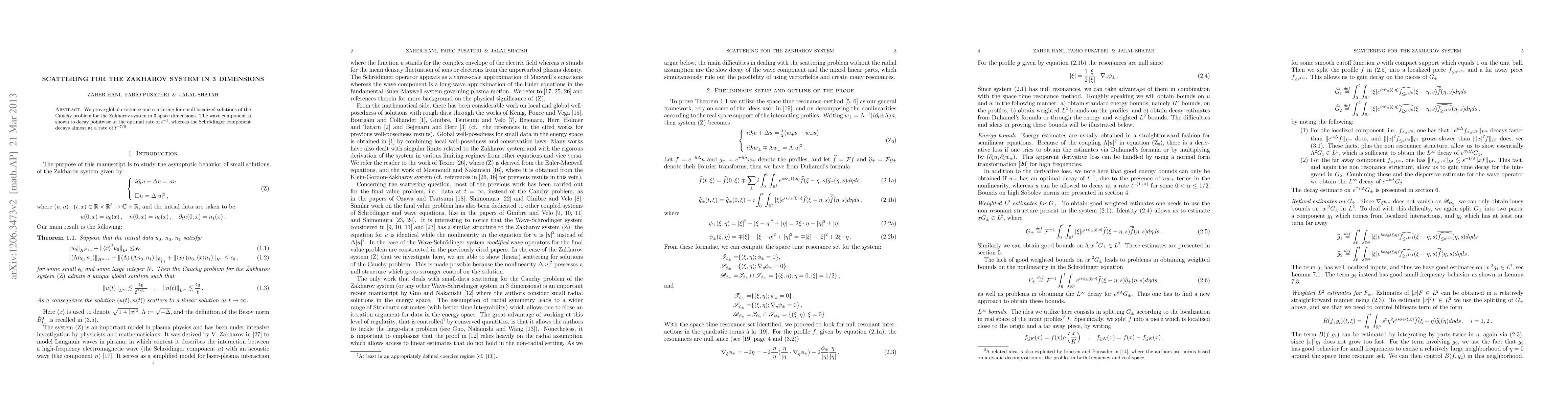 This paper proves global existence and scattering for small, localized solutions of the 3D Zakharov system, demonstrating optimal decay rates for the wave component at t^{-1} and near-optimal decay for the Schrödinger component at t^{-7/6}.