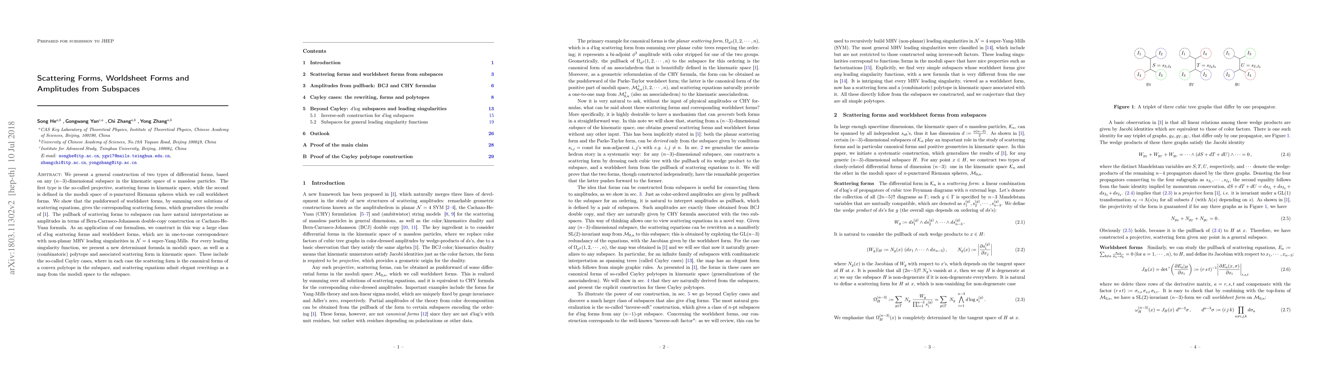 We present a general construction of two types of differential forms, based on any $(n{-}3)$-dimensional subspace in the kinematic space of $n$ massless particles. The first type is the so-called projective, scattering forms in kinematic space, while the second is defined in the moduli space of $n$-punctured Riemann spheres which we call worldsheet forms. We show that the pushforward of worldsheet forms, by summing over solutions of scattering equations, gives the corresponding scattering forms, which generalizes the results of [1711.09102]. The pullback of scattering forms to subspaces can have natural interpretations as amplitudes in terms of Bern-Carrasco-Johansson double-copy construction or Cachazo-He-Yuan formula. As an application of our formalism, we construct in this way a large class of $d\log$ scattering forms and worldsheet forms, which are in one-to-one correspondence with non-planar MHV leading singularities in ${\cal N}=4$ super-Yang-Mills. For every leading singularity function, we present a new determinant formula in moduli space, as well as a (combinatoric) polytope and associated scattering form in kinematic space. These include the so-called Cayley cases, where in each case the scattering form is the canonical forms of a convex polytope in the subspace, and scattering equations admit elegant rewritings as a map from the moduli space to the subspace.