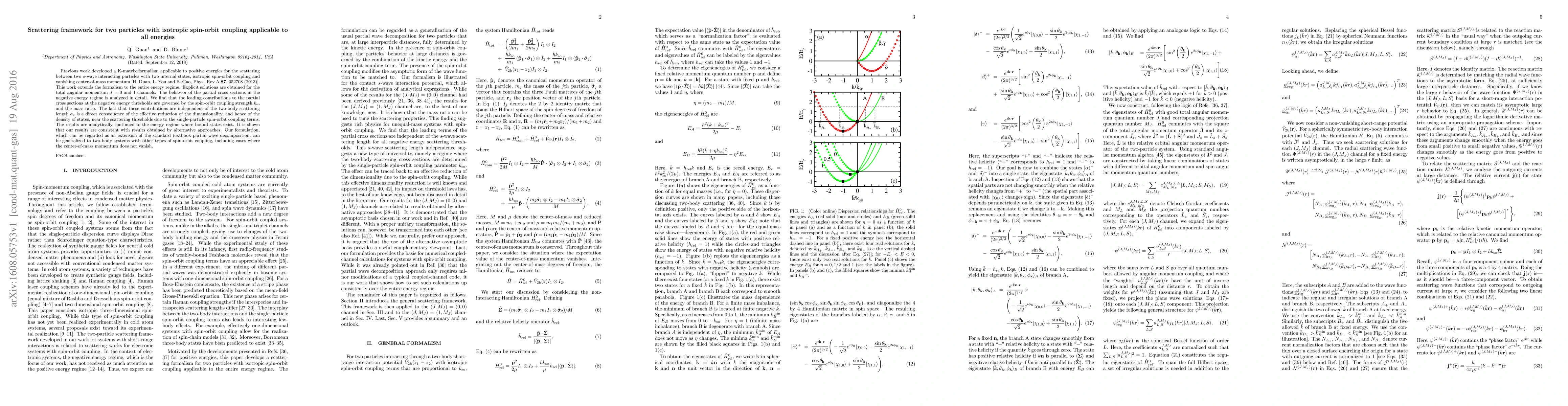 Previous work developed a K-matrix formalism applicable to positive energies for the scattering between two $s$-wave interacting particles with two internal states, isotropic spin-orbit coupling and vanishing center-of-mass momentum [H. Duan, L. You and B. Gao, Phys. Rev A {\bf{87}}, 052708 (2013)]. This work extends the formalism to the entire energy regime. Explicit solutions are obtained for the total angular momentum $J=0$ and $1$ channels. The behavior of the partial cross sections in the negative energy regime is analyzed in detail. We find that the leading contributions to the partial cross sections at the negative energy thresholds are governed by the spin-orbit coupling strength $k_{\text{so}}$ and the mass ratio. The fact that these contributions are independent of the two-body scattering length $a_s$ is a direct consequence of the effective reduction of the dimensionality, and hence of the density of states, near the scattering thresholds due to the single-particle spin-orbit coupling terms. The results are analytically continued to the energy regime where bound states exist. It is shown that our results are consistent with results obtained by alternative approaches. Our formulation, which can be regarded as an extension of the standard textbook partial wave decomposition, can be generalized to two-body systems with other types of spin-orbit coupling, including cases where the center-of-mass momentum does not vanish.