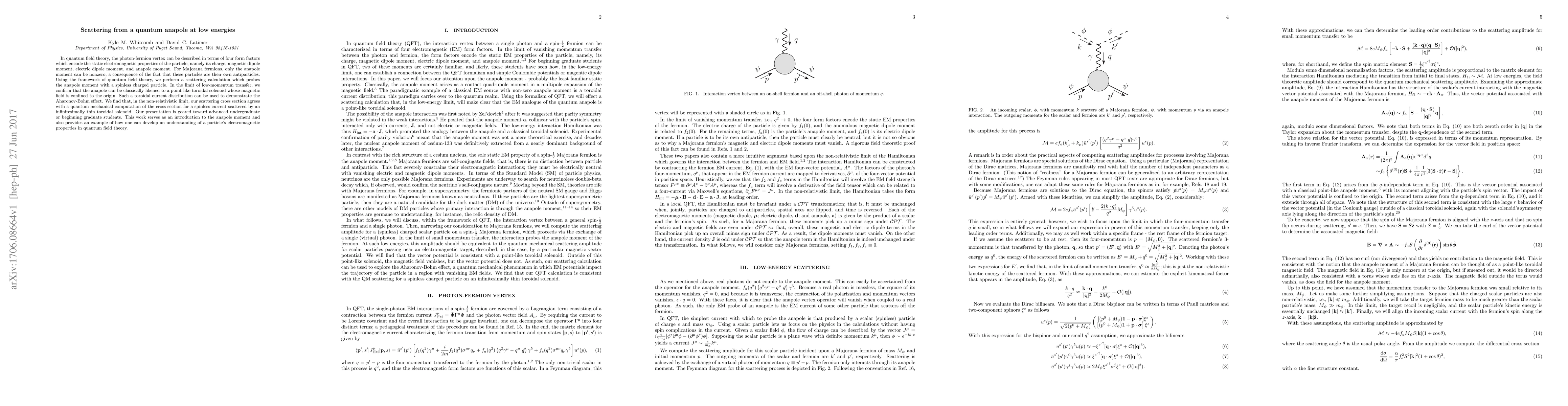 In quantum field theory, the photon-fermion vertex can be described in terms of four form factors which encode the static electromagnetic properties of the particle, namely its charge, magnetic dipole moment, electric dipole moment, and anapole moment. For Majorana fermions, only the anapole moment can be nonzero, a consequence of the fact that these particles are their own antiparticles. Using the framework of quantum field theory, we perform a scattering calculation which probes the anapole moment with a spinless charged particle. In the limit of low-momentum transfer, we confirm that the anapole can be classically likened to a point-like toroidal solenoid whose magnetic field is confined to the origin. Such a toroidal current distribution can be used to demonstrate the Aharonov-Bohm effect. We find that, in the non-relativistic limit, our scattering cross section agrees with a quantum mechanical computation of the cross section for a spinless current scattered by an infinitesimally thin toroidal solenoid. Our presentation is geared toward advanced undergraduate or beginning graduate students. This work serves as an introduction to the anapole moment and also provides an example of how one can develop an understanding of a particle's electromagnetic properties in quantum field theory.