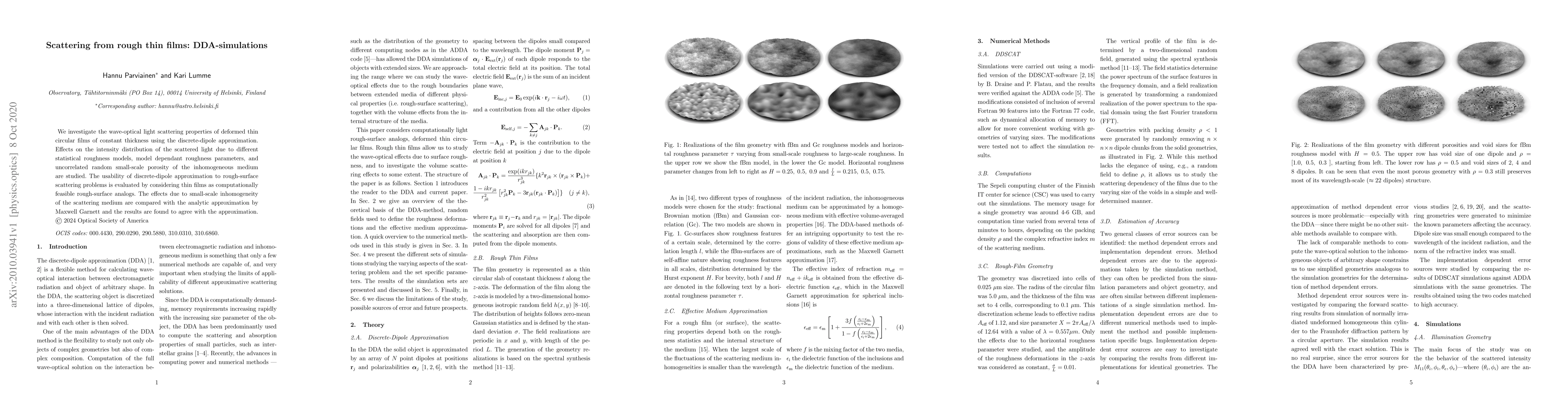 We investigate the wave-optical light scattering properties of deformed thin circular films of constant thickness using the discrete-dipole approximation. Effects on the intensity distribution of the scattered light due to different statistical roughness models, model dependant roughness parameters, and uncorrelated random small-scale porosity of the inhomogeneous medium are studied. The usability of discrete-dipole approximation to rough-surface scattering problems is evaluated by considering thin films as computationally feasible rough-surface analogs. The effects due to small-scale inhomogeneity of the scattering medium are compared with the analytic approximation by Maxwell Garnett and the results are found to agree with the approximation.