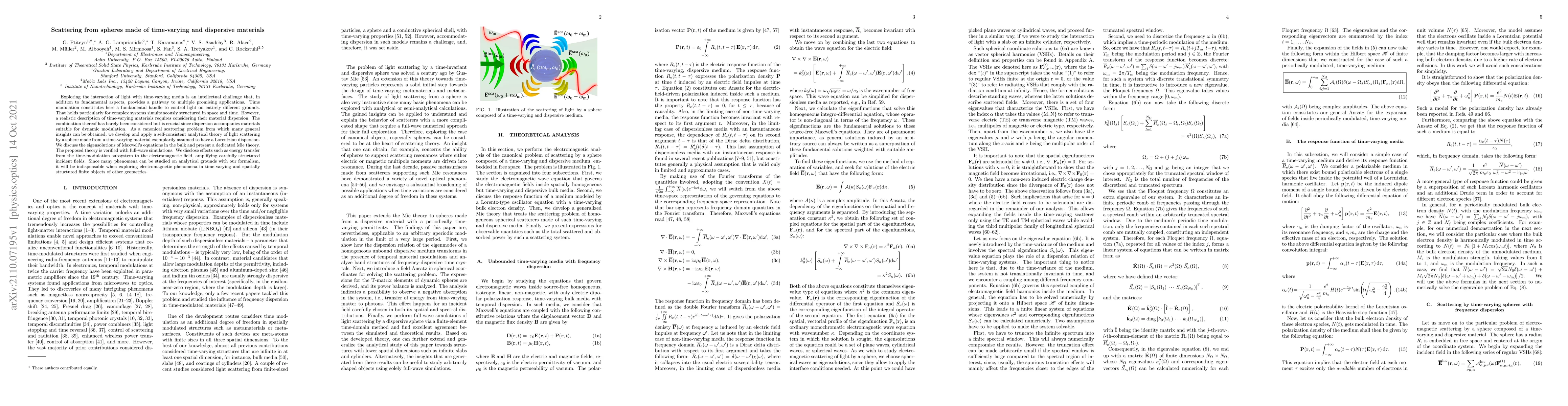 This paper develops a self-consistent analytical theory for light scattering by a sphere made from time-varying and dispersive materials, exemplified by a Lorentzian dispersion model. The study reveals energy transfer effects and structured field amplification, validated through full-wave simulations, providing a foundational approach for exploring electromagnetic phenomena in dynamic media.