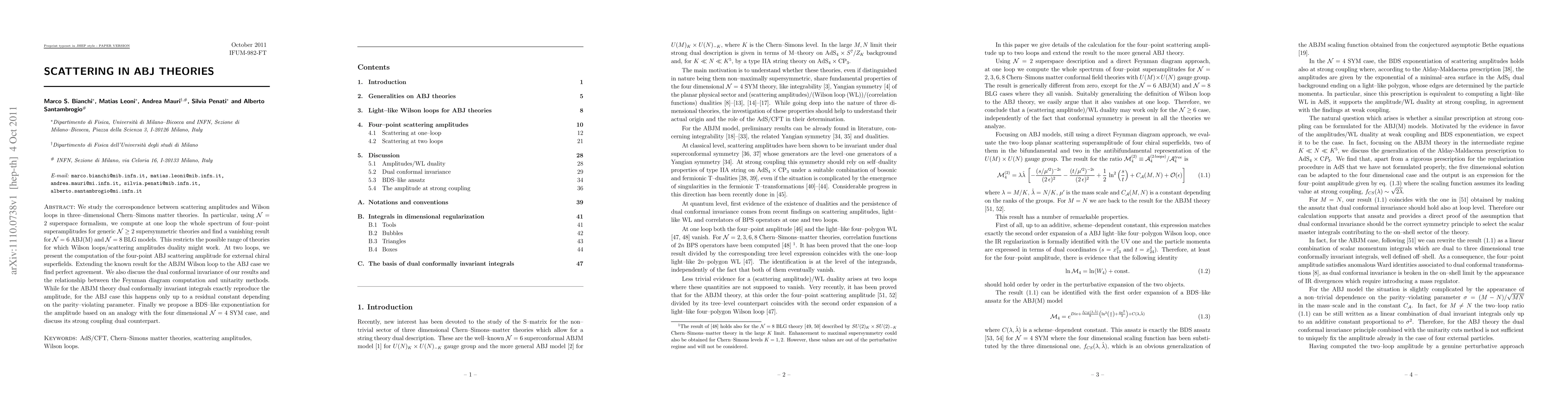 We study the correspondence between scattering amplitudes and Wilson loops in three-dimensional Chern-Simons matter theories. In particular, using N=2 superspace formalism, we compute at one loop the whole spectrum of four-point superamplitudes for generic N>=2 supersymmetric theories and find a vanishing result for N=6 ABJ(M) and N=8 BLG models. This restricts the possible range of theories for which Wilson loops/scattering amplitudes duality might work. At two loops, we present the computation of the four-point ABJ scattering amplitude for external chiral superfields. Extending the known result for the ABJM Wilson loop to the ABJ case we find perfect agreement. We also discuss the dual conformal invariance of our results and the relationship between the Feynman diagram computation and unitarity methods. While for the ABJM theory dual conformally invariant integrals exactly reproduce the amplitude, for the ABJ case this happens only up to a residual constant depending on the parity-violating parameter. Finally we propose a BDS-like exponentiation for the amplitude based on an analogy with the four-dimensional N=4 SYM case, and discuss its strong coupling dual counterpart.