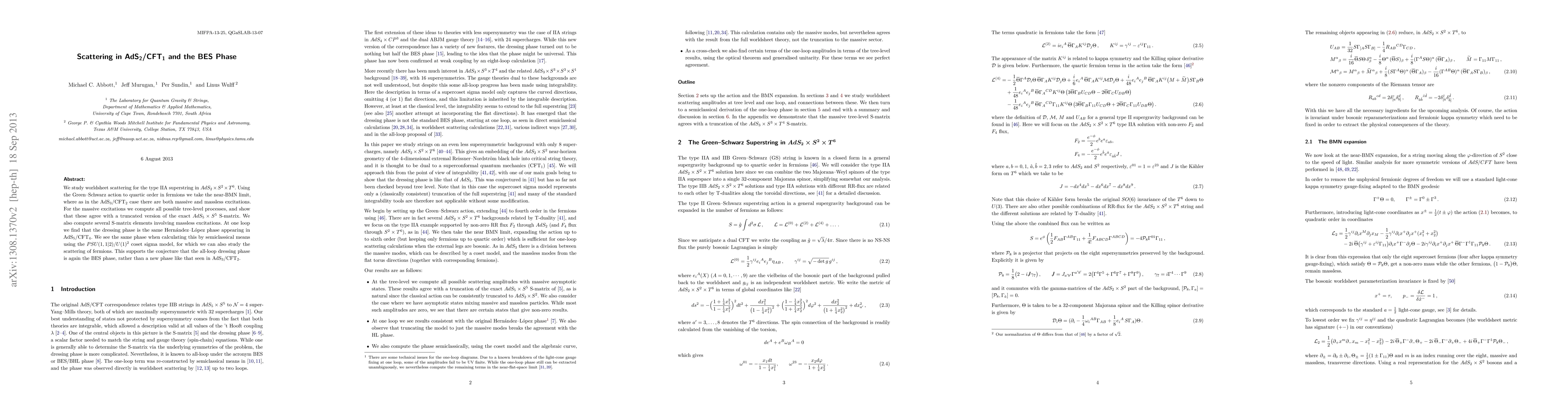 The paper investigates worldsheet scattering for type IIA superstring in AdS(2) x S(2) x T(6) and finds agreement between massive excitations' tree-level processes and a truncated AdS(5) x S(5) S-matrix. The study also supports the conjecture that the dressing phase at all loops is the BES phase rather than a new phase, similar to the phase found in AdS(5)/CFT(4).