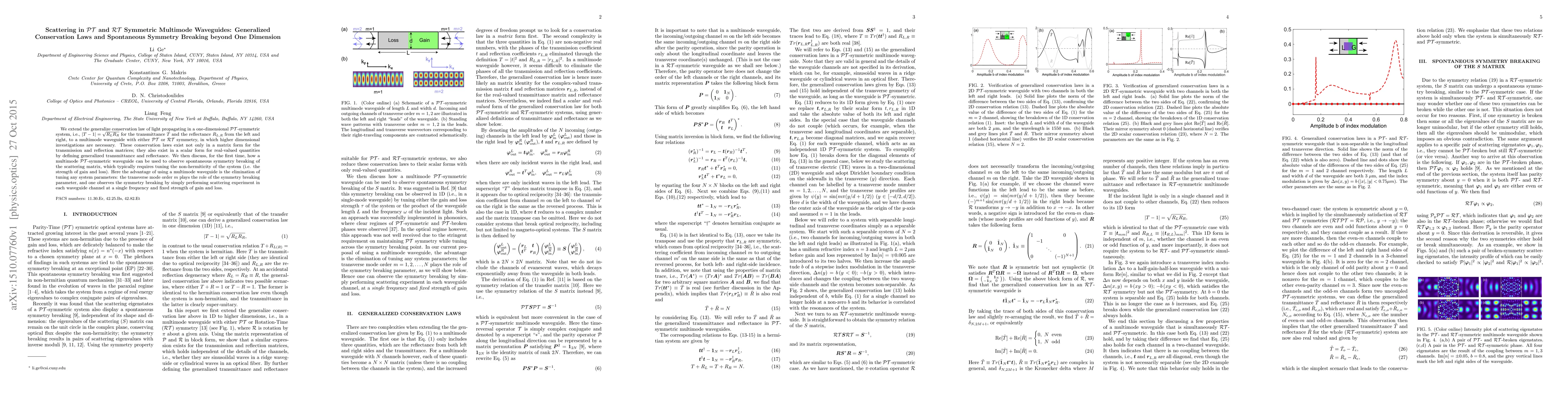 We extend the generalize conservation law of light propagating in a one-dimensional $\cal PT$-symmetric system, i.e., $|T-1|=\sqrt{R_LR_R}$ for the transmittance $T$ and the reflectance $R_{L,R}$ from the left and right, to a multimode waveguide with either $\cal PT$ or $\cal RT$ symmetry, in which higher dimensional investigations are necessary. These conservation laws exist not only in a matrix form for the transmission and reflection matrices; they also exist in a scalar form for real-valued quantities by defining generalized transmittance and reflectance. We then discuss, for the first time, how a multimode $\cal PT$-symmetric waveguide can be used to observe spontaneous symmetry breaking of the scattering matrix, which typically requires tuning the non-hermiticity of the system (i.e. the strength of gain and loss). Here the advantage of using a multimode waveguide is the elimination of tuning any system parameters: the transverse mode order $m$ plays the role of the symmetry breaking parameter, and one observes the symmetry breaking by simply performing scattering experiment in each waveguide channel at a single frequency and fixed strength of gain and loss.