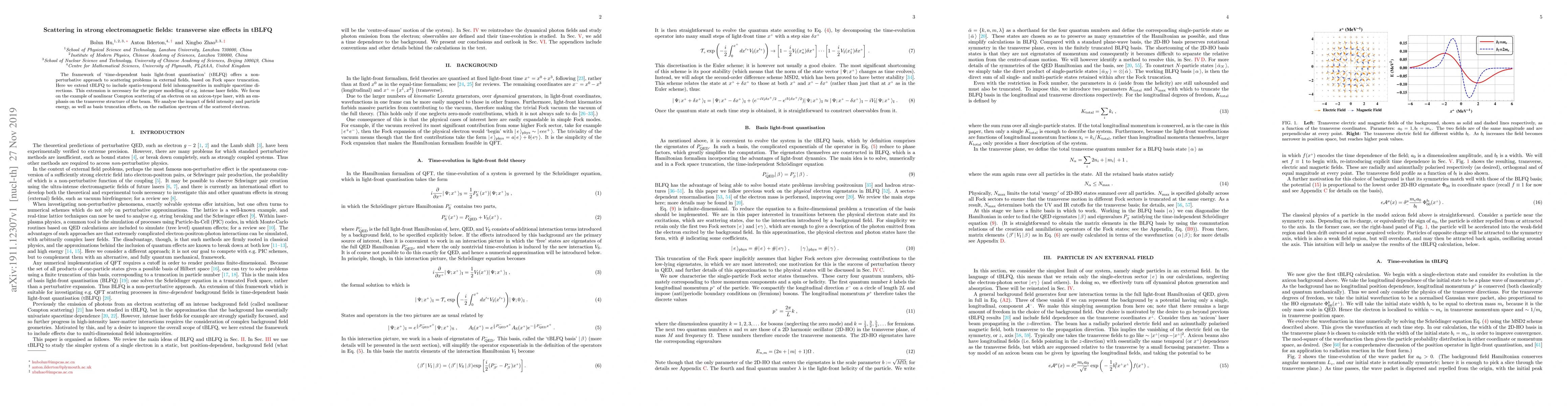 The framework of 'time-dependent basis light-front quantisation' (tBLFQ) offers a non-perturbative approach to scattering problems in external fields, based on Fock space truncation. Here we extend tBLFQ to include spatio-temporal field inhomogeneities in multiple spacetime directions. This extension is necessary for the proper modelling of e.g. intense laser fields. We focus on the example of nonlinear Compton scattering of an electron on an axicon-type laser, with an emphasis on the transverse structure of the beam. We analyse the impact of field intensity and particle energy, as well as basis truncation effects, on the radiation spectrum of the scattered electron.