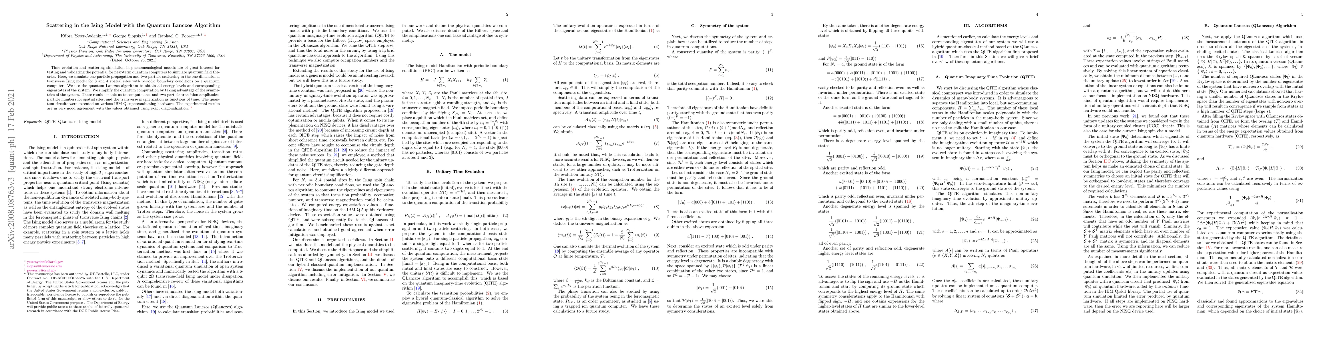 Time evolution and scattering simulation in phenomenological models are of great interest for testing and validating the potential for near-term quantum computers to simulate quantum field theories. Here, we simulate one-particle propagation and two-particle scattering in the one-dimensional transverse Ising model for 3 and 4 spatial sites with periodic boundary conditions on a quantum computer. We use the quantum Lanczos algorithm to obtain all energy levels and corresponding eigenstates of the system. We simplify the quantum computation by taking advantage of the symmetries of the system. These results enable us to compute one- and two-particle transition amplitudes, particle numbers for spatial sites, and the transverse magnetization as functions of time. The quantum circuits were executed on IBM 5-qubit superconducting hardware. The experimental results with readout error mitigation are in very good agreement with the values obtained using exact diagonalization.