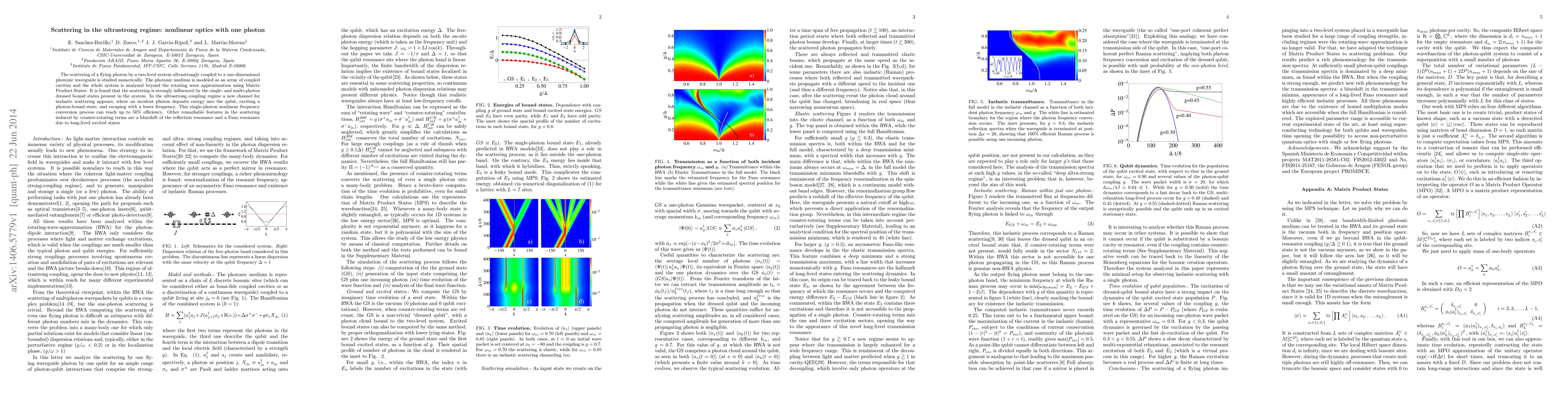 The scattering of a flying photon by a two-level system ultrastrongly coupled to a one-dimensional photonic waveguide is studied numerically. The photonic medium is modeled as an array of coupled cavities and the whole system is analyzed beyond the rotating wave approximation using Matrix Product States. It is found that the scattering is strongly influenced by the single- and multi-photon dressed bound states present in the system. In the ultrastrong coupling regime a new channel for inelastic scattering appears, where an incident photon deposits energy into the qubit, exciting a photon-bound state, and escaping with a lower frequency. This single-photon nonlinear frequency conversion process can reach up to 50\% efficiency. Other remarkable features in the scattering induced by counter-rotating terms are a blueshift of the reflection resonance and a Fano resonance due to long-lived excited states
