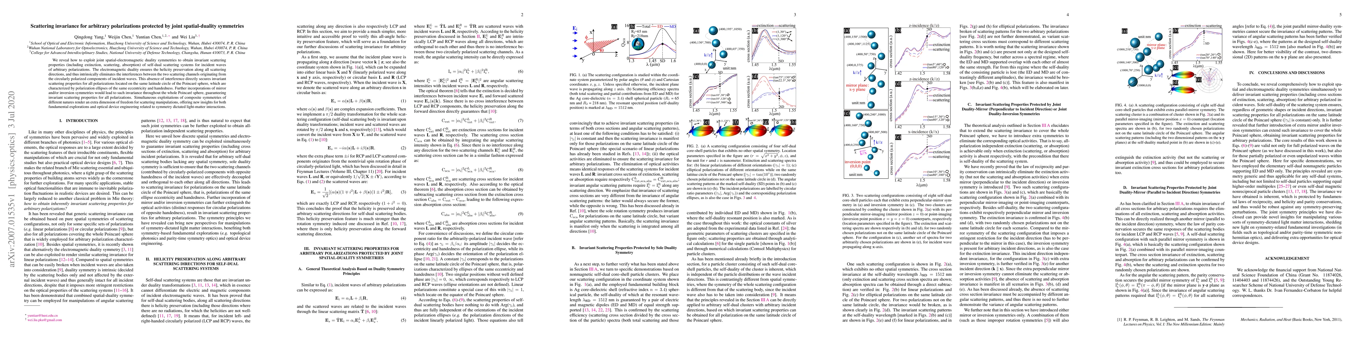We reveal how to exploit joint spatial-electromagnetic duality symmetries to obtain invariant scattering properties (including extinction, scattering, absorption) of self-dual scattering systems for incident waves of arbitrary polarizations. The electromagnetic duality ensures the helicity preservation along all scattering directions, and thus intrinsically eliminates the interferences between the two scattering channels originating from the circularly polarized components of incident waves. This absence of interference directly secures invariant scattering properties for all polarizations located on the same latitude circle of the Poincar\'{e} sphere, which are characterized by polarization ellipses of the same eccentricity and handedness. Further incorporations of mirror and/or inversion symmetries would lead to such invariance throughout the whole Poincar\'{e} sphere, guaranteeing invariant scattering properties for all polarizations. Simultaneous exploitations of composite symmetries of different natures render an extra dimension of freedom for scattering manipulations, offering new insights for both fundamental explorations and optical device engineering related to symmetry dictated light-matter interactions.