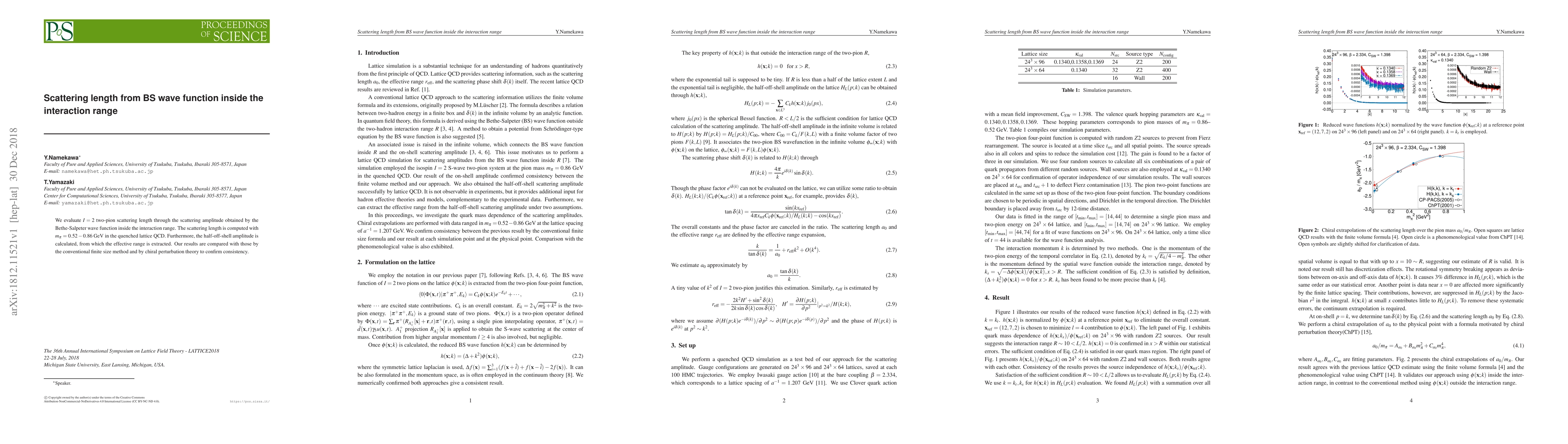 We evaluate $I=2$ two-pion scattering length through the scattering amplitude obtained by the Bethe-Salpeter wave function inside the interaction range. The scattering length is computed with $m_\pi = 0.52-0.86$ GeV in the quenched lattice QCD. Furthermore, the half-off-shell amplitude is calculated, from which the effective range is extracted. Our results are compared with those by the conventional finite size method and by chiral perturbation theory to confirm consistency.