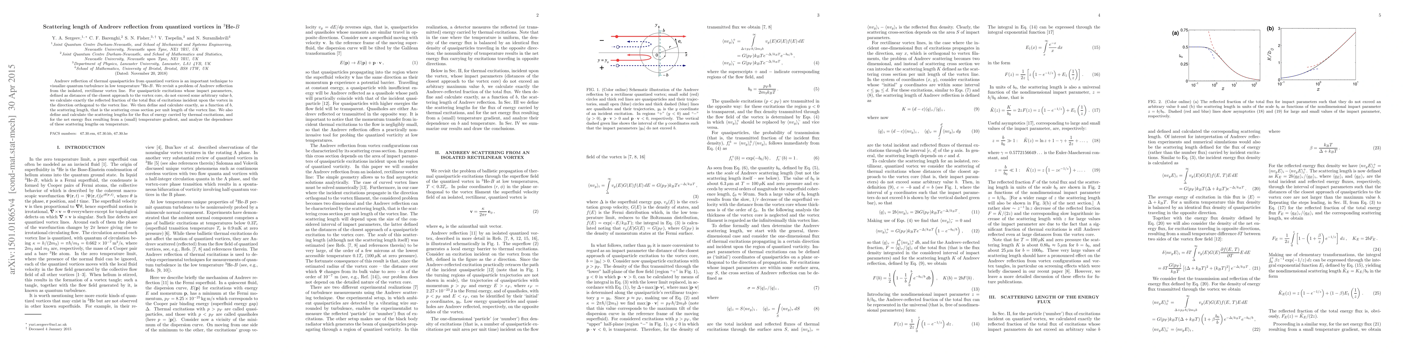 This paper calculates the scattering length of Andreev reflection from quantized vortices in $^3$He-$B$, determining the scattering cross-section per unit length for thermal quasiparticles and energy fluxes. The study analyzes how these scattering lengths depend on temperature and quasiparticle impact parameters.