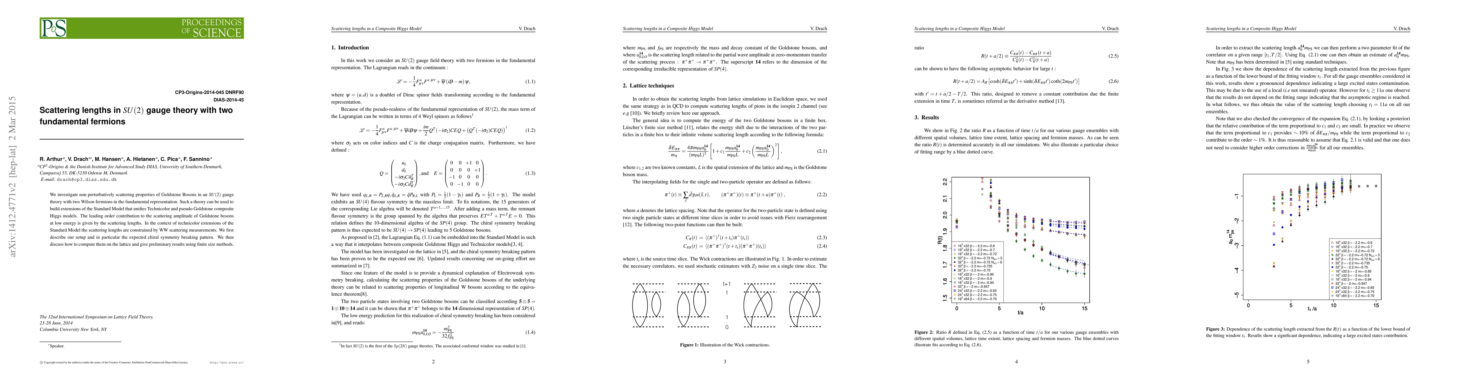 We investigate non perturbatively scattering properties of Goldstone Bosons in an SU(2) gauge theory with two Wilson fermions in the fundamental representation. Such a theory can be used to build extensions of the Standard Model that unifies Technicolor and pseudo Goldstone composite Higgs models. The leading order contribution to the scattering amplitude of Goldstone bosons at low energy is given by the scattering lengths. In the context of technicolor extensions of the Standard Model the scattering lengths are constrained by WW scattering measurements. We first describe our setup and in particular the expected chiral symmetry breaking pattern. We then discuss how to compute them on the lattice and give preliminary results using finite size methods.