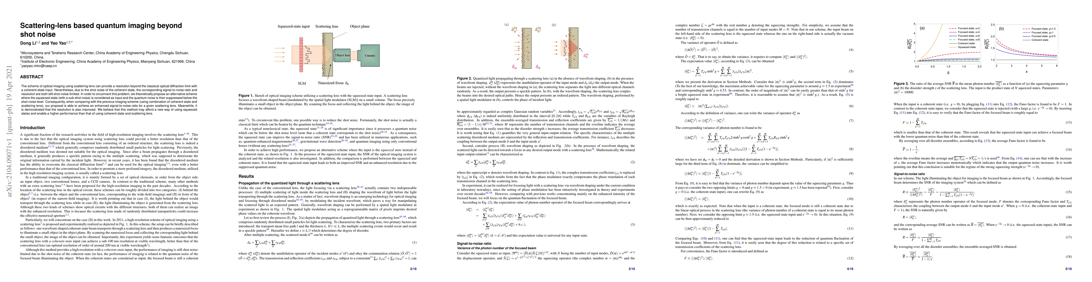The scheme of optical imaging using scattering lens can provide a resolution beyond the classical optical diffraction limit with a coherent-state input. Nevertheless, due to the shot noise of the coherent state, the corresponding signal-to-noise ratio and resolution are both still shot-noise-limited. In order to circumvent this problem, we theoretically propose an alternative scheme where the squeezed state (with a sub-shot noise) is considered as input and the quantum noise is then suppressed below the shot-noise level. Consequently, when comparing with the previous imaging scheme (using combination of coherent state and scattering lens), our proposal is able to achieve an enhanced signal-to-noise ratio for a given scattering lens. Meanwhile, it is demonstrated that the resolution is also improved. We believe that this method may afford a new way of using squeezed states and enable a higher performance than that of using coherent state and scattering lens.