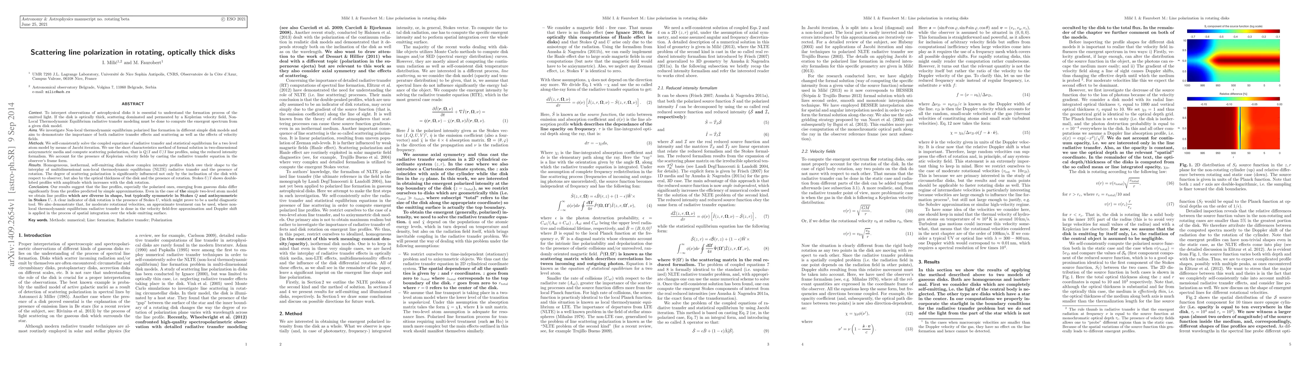This paper investigates the scattering polarization in optically thick, rotating disks using Non-Local Thermodynamic Equilibrium radiative transfer modeling. It finds that scattering polarization, especially in Stokes U, is significantly influenced by disk inclination, optical thickness, and rotation, suggesting that detailed modeling is necessary for accurate interpretation of astrophysical disk observations.