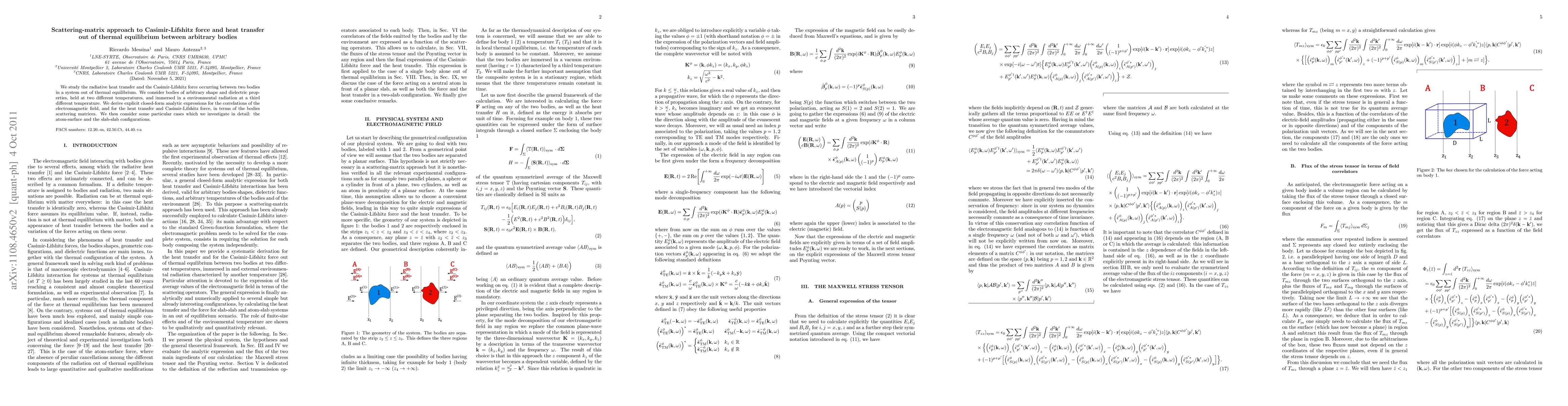 Summary: This research develops a scattering-matrix approach to derive closed-form expressions for radiative heat transfer and Casimir-Lifshitz force between arbitrarily shaped bodies at different temperatures, considering environmental radiation. Detailed analyses of specific configurations, such as atom-surface and slab-slab interactions, are also provided.