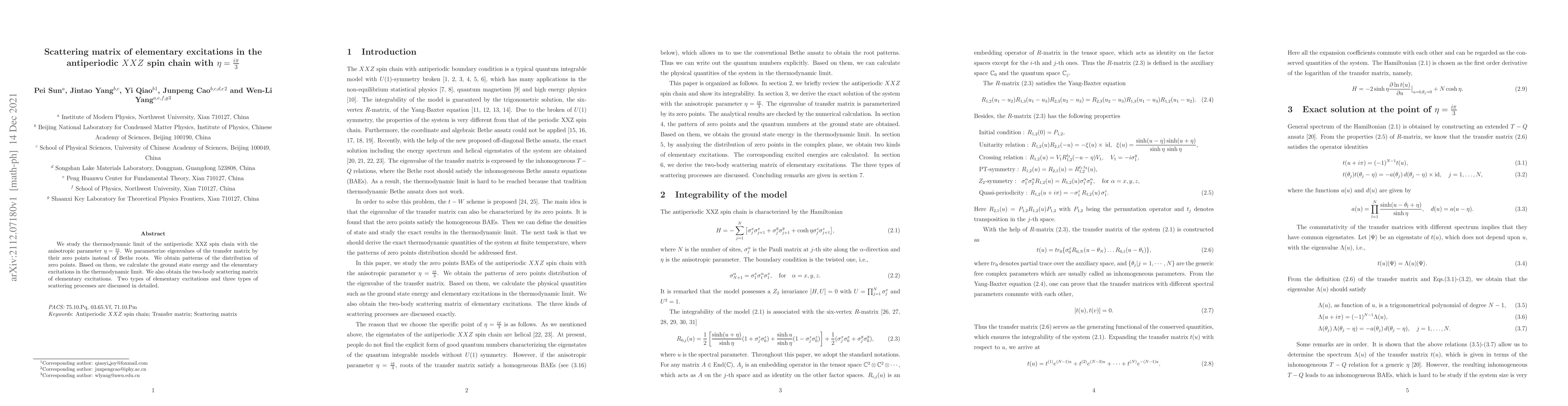 This paper investigates the thermodynamic limit of the antiperiodic XXZ spin chain with $\eta=\frac{\pi i}{3}$, deriving the distribution of zero points of the transfer matrix's eigenvalues. It calculates the ground state energy and the scattering matrix for elementary excitations, detailing two types of excitations and three scattering processes.