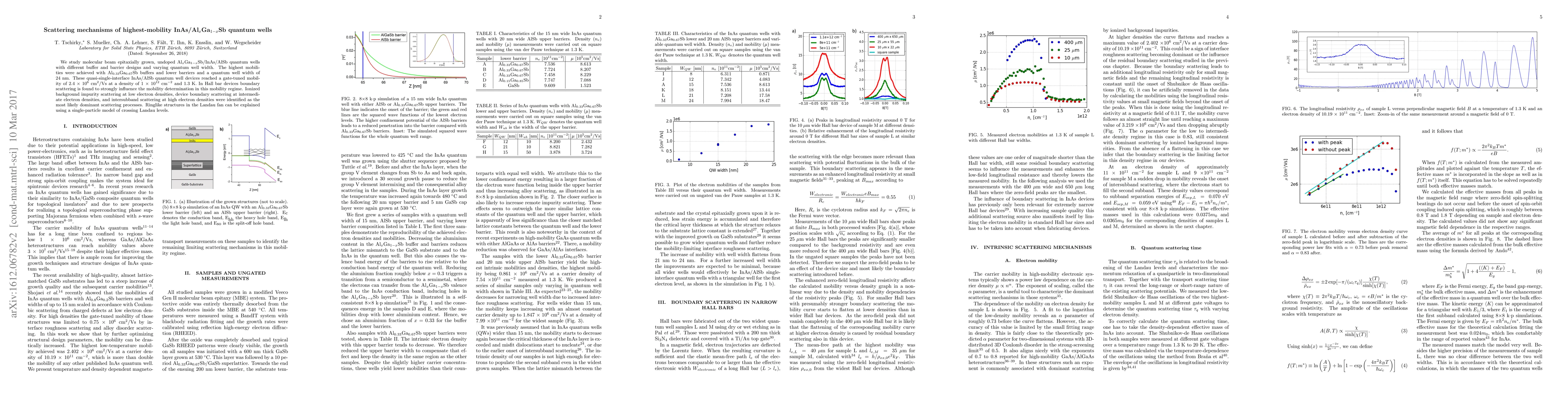 This paper investigates the scattering mechanisms in high-mobility InAs/Al$_{x}$Ga$_{1-x}$Sb quantum wells, achieving peak mobility with specific buffer and barrier designs. Dominant scattering processes identified include ionized impurity, boundary, and intersubband scattering, with boundary scattering significantly impacting mobility.