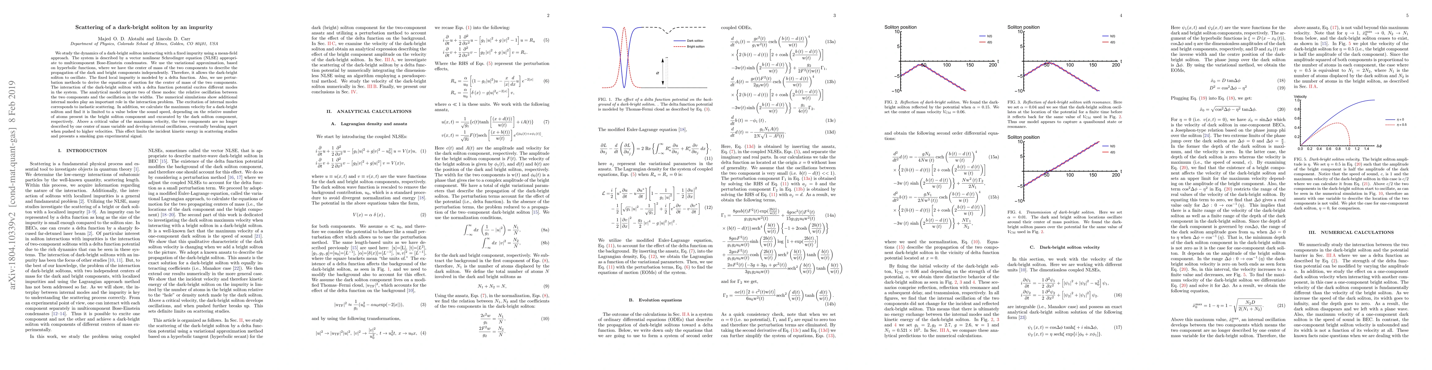 We study the dynamics of a dark-bright soliton interacting with a fixed impurity using a mean-field approach. The system is described by a vector nonlinear Schrodinger equation (NLSE) appropriate to multicomponent Bose-Einstein condensates. We use the variational approximation, based on hyperbolic functions, where we have the center of mass of the two components to describe the propagation of the dark and bright components independently. Therefore, it allows the dark-bright soliton to oscillate. The fixed local impurity is modeled by a delta function. Also, we use perturbation methods to derive the equations of motion for the center of mass of the two components. The interaction of the dark-bright soliton with a delta function potential excites different modes in the system. The analytical model capture two of these modes: the relative oscillation between the two components and the oscillation in the widths. The numerical simulations show additional internal modes play an important role in the interaction problem. The excitation of internal modes corresponds to inelastic scattering. In addition, we calculate the maximum velocity for a dark-bright soliton and find it is limited to a value below the sound speed, depending on the relative number of atoms present in the bright soliton component and excavated by the dark soliton component, respectively. Above a critical value of the maximum velocity, the two components are no longer described by one center of mass variable and develop internal oscillations, eventually breaking apart when pushed to higher velocities. This effect limits the incident kinetic energy in scattering studies and presents a smoking gun experimental signal.