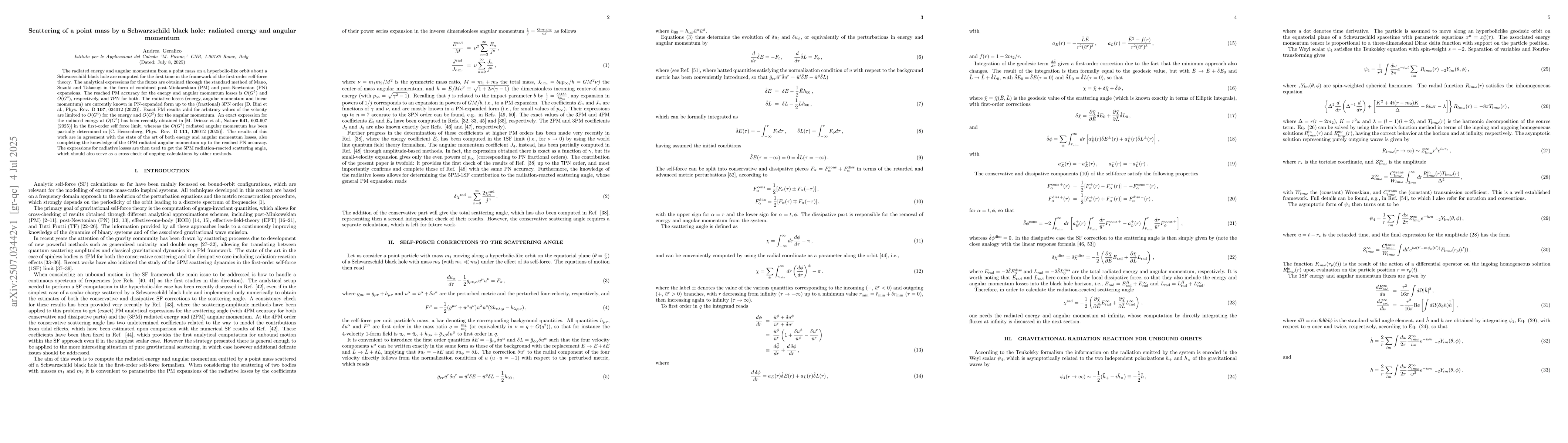 The radiated energy and angular momentum from a point mass on a hyperbolic-like orbit about a Schwarzschild black hole are computed for the first time in the framework of the first-order self-force theory. The analytical expressions for the fluxes are obtained through the standard method of Mano, Suzuki and Takasugi in the form of combined post-Minkowskian (PM) and post-Newtonian (PN) expansions. The reached PM accuracy for the energy and angular momentum losses is $O(G^5)$ and $O(G^4)$, respectively, and 7PN for both. The radiative losses (energy, angular momentum and linear momentum) are currently known in PN-expanded form up to the (fractional) 3PN order [D. Bini et al., Phys. Rev. D \textbf{107}, 024012 (2023)]. Exact PM results valid for arbitrary values of the velocity are limited to $O(G^4)$ for the energy and $O(G^3)$ for the angular momentum. An exact expression for the radiated energy at $O(G^5)$ has been recently obtained in [M. Driesse et al., Nature \textbf{641}, 603-607 (2025)] in the first-order self force limit, whereas the $O(G^4)$ radiated angular momentum has been partially determined in [C. Heissenberg, Phys. Rev. D \textbf{111}, 126012 (2025)]. The results of this work are in agreement with the state of the art of both energy and angular momentum losses, also completing the knowledge of the 4PM radiated angular momentum up to the reached PN accuracy. The expressions for radiative losses are then used to get the 5PM radiation-reacted scattering angle, which should also serve as a cross-check of ongoing calculations by other methods.