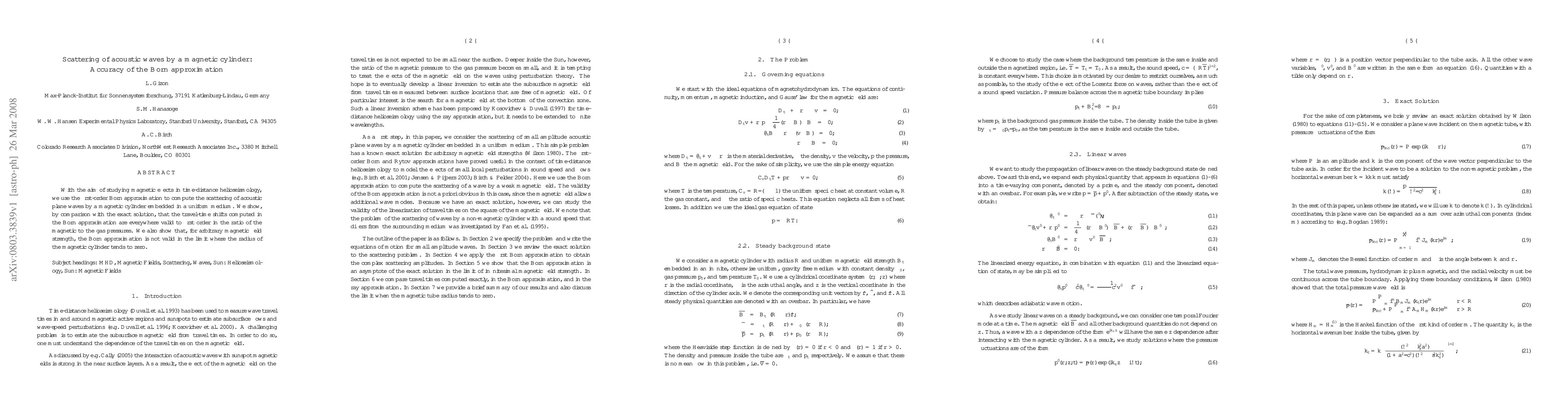 This paper investigates the scattering of acoustic waves by a magnetic cylinder in helioseismology using the first-order Born approximation, demonstrating its validity for travel-time shifts in magnetic effects. It concludes that the Born approximation fails when the magnetic cylinder's radius approaches zero.