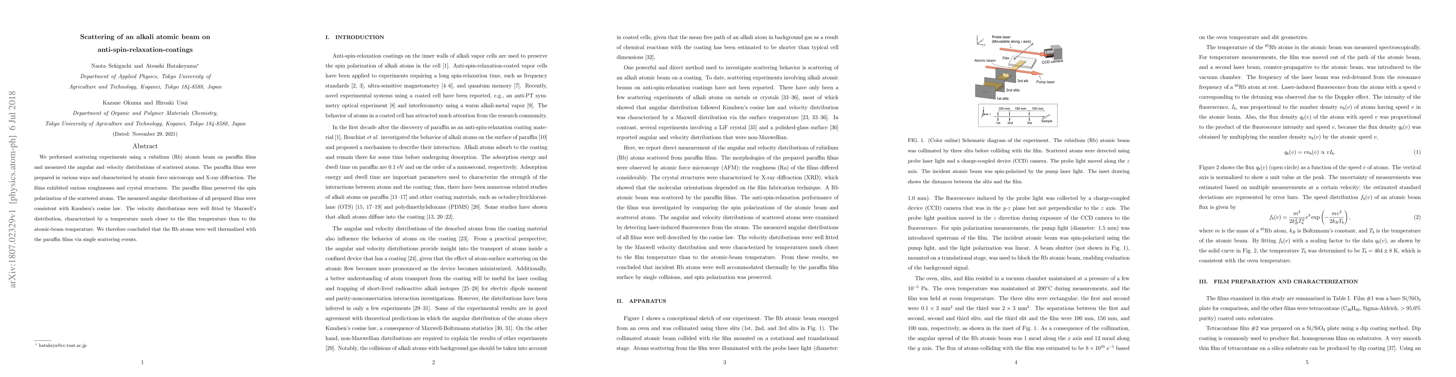 We performed scattering experiments using a rubidium (Rb) atomic beam on paraffin films and measured the angular and velocity distributions of scattered atoms. The paraffin films were prepared in various ways and characterized by atomic force microscopy and X-ray diffraction. The films exhibited various roughnesses and crystal structures. The paraffin films preserved the spin polarization of the scattered atoms. The measured angular distributions of all prepared films were consistent with Knudsen's cosine law. The velocity distributions were well fitted by Maxwell's distribution, characterized by a temperature much closer to the film temperature than to the atomic-beam temperature. We therefore concluded that the Rb atoms were well thermalized with the paraffin films via single scattering events.