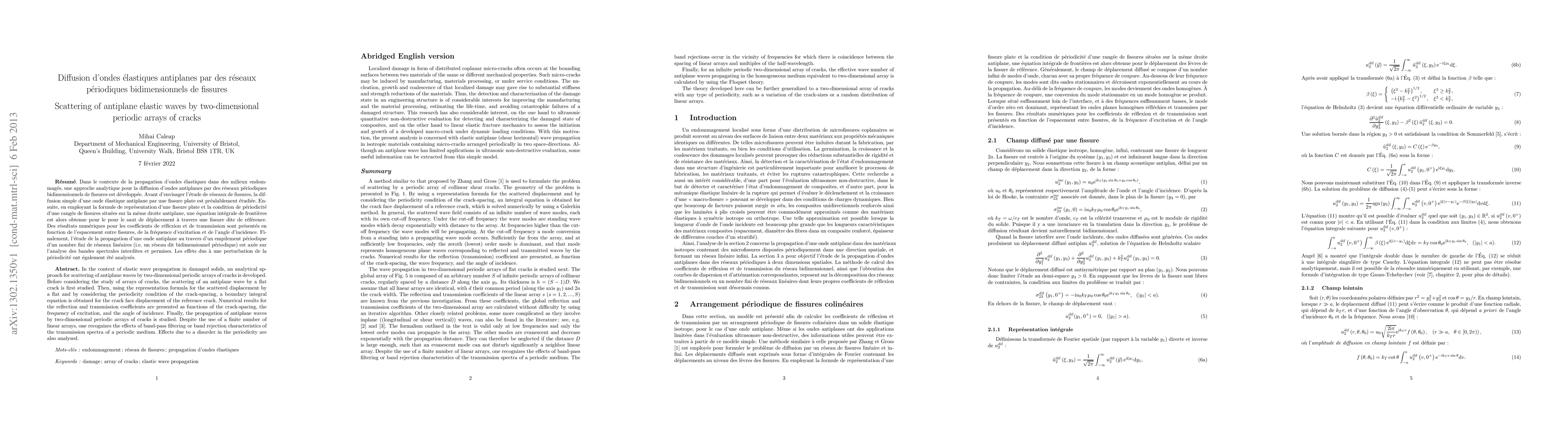 In the context of elastic wave propagation in damaged solids, an analytical approach for scattering of antiplane waves by two-dimensional periodic arrays of cracks is developed. Before considering the study of arrays of cracks, the scattering of an antiplane wave by a flat crack is first studied. Then, using the representation formula for the scattered displacement by a flat and by considering the periodicity condition of the crack-spacing, a boundary integral equation is obtained for the crack face displacement of the reference crack. Numerical results for the reflection and transmission coefficients are presented as functions of the crack-spacing, the frequency of excitation, and the angle of incidence. Finally, the propagation of antiplane waves by two-dimensional periodic arrays of cracks is studied. Despite the use of a finite number of linear arrays, one recognizes the effects of band-pass filtering or band rejection characteristics of the transmission spectra of a periodic medium. Effects due to a disorder in the periodicity are also analysed.