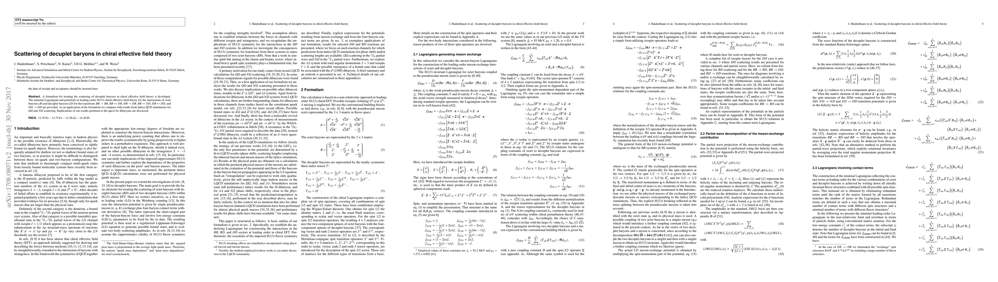 A formalism for treating the scattering of decuplet baryons in chiral effective field theory is developed. The minimal Lagrangian and potentials in leading-order SU(3) chiral effective field theory for the interactions of octet baryons ($B$) and decuplet baryons ($D$) for the transitions $BB\to BB$, $BB\leftrightarrow DB$, $DB\to DB$, $BB\leftrightarrow DD$, $DB\leftrightarrow DD$, and $DD\to DD$ are provided. As an application of the formalism we compare with results from lattice QCD simulations for $\Omega\Omega$ and $N\Omega$ scattering. Implications of our results pertinent to the quest for dibaryons are discussed.