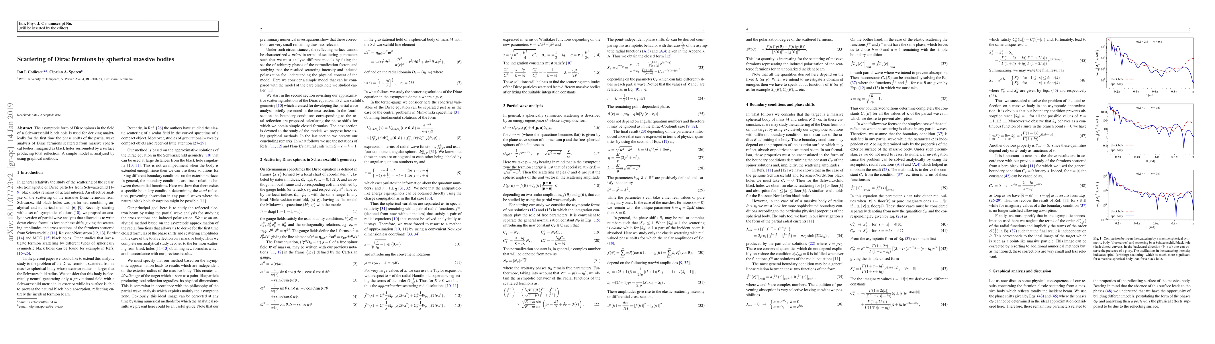 This paper analytically derives the phase shifts for Dirac fermions scattered by spherical massive bodies, modeled as Schwarzschild black holes with a reflective surface, for the first time using the asymptotic form of Dirac spinors. Graphical methods are employed to analyze the simple model.