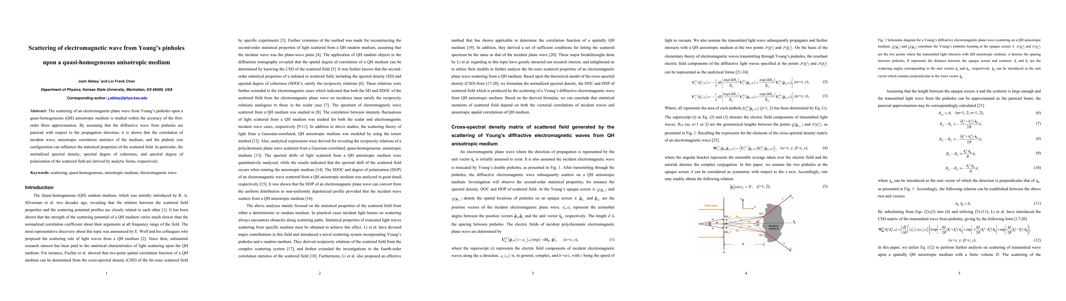 The scattering of an electromagnetic plane wave from Young pinholes upon a quasi-homogeneous (QH) anisotropic medium is studied within the accuracy of the first-order Born approximation. By assuming that the diffractive wave from pinholes are paraxial with respect to the propagation direction, it is shown that the correlation of incident wave, anisotropic correlation statistics of the medium, and the pinhole size configuration can influence the statistical properties of the scattered field. In particular, the normalized spectral density, spectral degree of coherence, and spectral degree of polarization of the scattered field are derived by analytic forms, respectively.