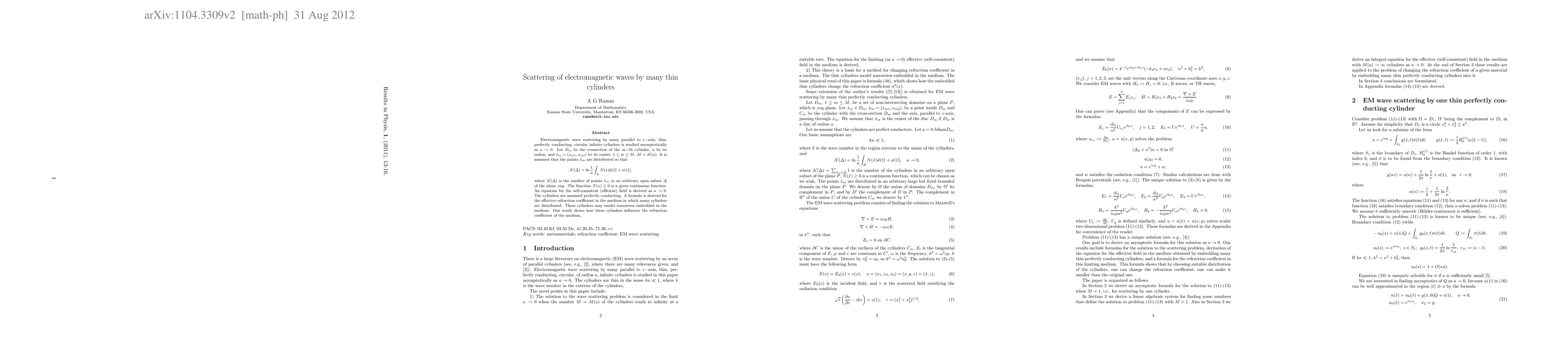 Electromagnetic wave scattering by many parallel infinite cylinders is studied asymptotically as $a\to 0$. Here $a$ is the radius of the cylinders. It is assumed that the points $\hat{x}_m$ are distributed so that $\mathcal{N}(\Delta)=\frac{1}{a}\int_{\Delta}N(x)dx[1+o(1)], $ where $\mathcal{N}(\Delta)$ is the number of points $\hat{x}_m=(x_{m1},x_{m2})$ in an arbitrary open subset of the plane $xoy$, the axes of the cylinders are passing through points $\hat{x}_m$, these axes are parallel to the z-axis. The function $N(x)\geq 0$ is a given continuous function. An equation for the self-consistent (efficient) field is derived as $a\to 0$. The cylinders are assumed perfectly conducting. Formula is derived for the effective refraction coefficient in the medium in which many cylinders are distributed.