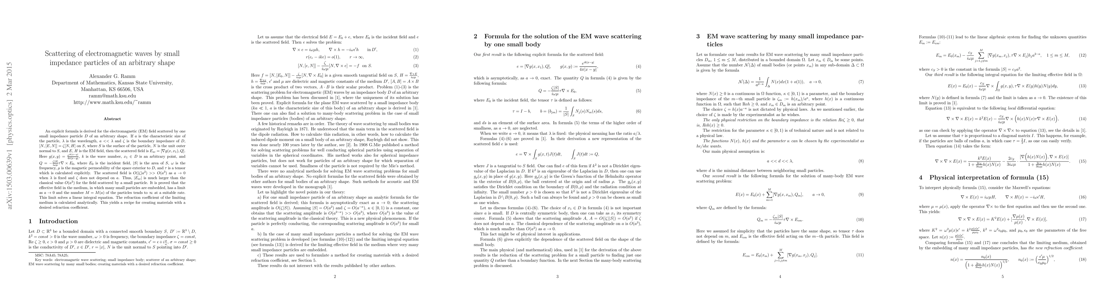 An explicit formula is derived for the electromagnetic (EM) field scattered by one small impedance particle $D$ of an arbitrary shape. If $a$ is the characteristic size of the particle, $\lambda$ is the wavelength, $a<<\lambda$ and $\zeta$ is the boundary impedance of $D$, $[N,[E,N]]=\zeta [N,H]$ on $S$, where $S$ is the surface of the particle, $N$ is the unit outer normal to $S$, and $E$, $H$ is the EM field, then the scattered field is $E_{sc}=[\nabla g(x,x_1), Q]$. Here $g(x,y)=\frac{e^{ik|x-y|}}{4\pi |x-y|}$, $k$ is the wave number, $x_1\in D$ is an arbitrary point, and $Q=-\frac{\zeta |S|}{i\omega \mu}\tau \nabla \times E_0$, where $E_0$ is the incident field, $|S|$ is the area of $S$, $\omega$ is the frequency, $\mu$ is the magnetic permeability of the space exterior to $D$, and $\tau$ is a tensor which is calculated explicitly. The scattered field is $O(|\zeta| a^2)>> O(a^3)$ as $a\to 0$ when $\lambda$ is fixed and $\zeta$ does not depend on $a$. Thus, $|E_{sc}|$ is much larger than the classical value $O(a^3)$ for the field scattered by a small particle. It is proved that the effective field in the medium, in which many small particles are embedded, has a limit as $a\to 0$ and the number $M=M(a)$ of the particles tends to $\infty$ at a suitable rate. Thislimit solves a linear integral equation. The refraction coefficient of the limiting medium is calculated analytically. This yields a recipe for creating materials with a desired refraction coefficient.