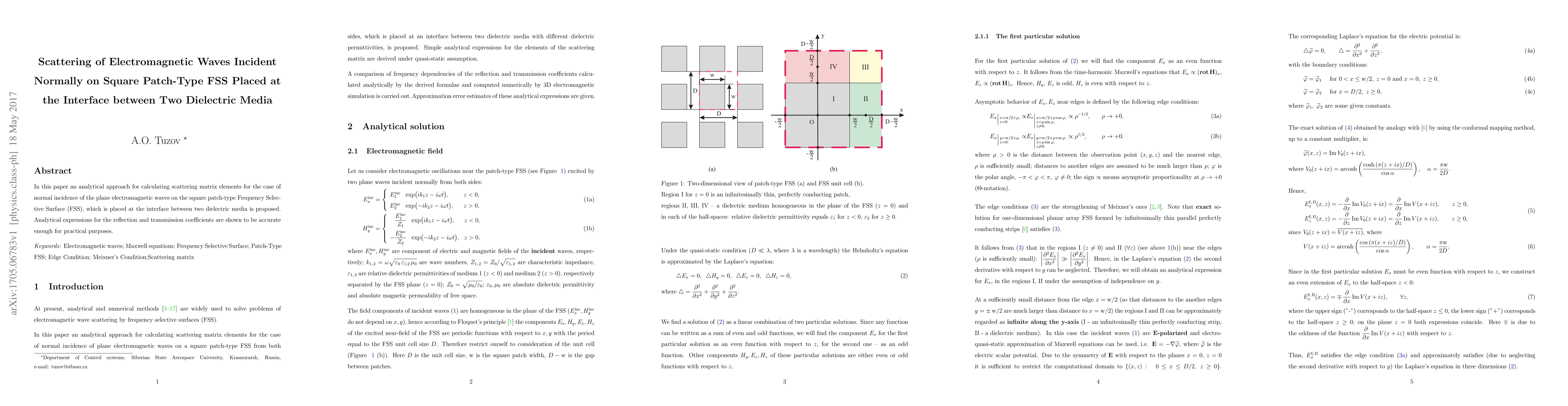 An analytical approach for calculating scattering matrix elements is proposed for square patch-type FSS at interface between two dielectric media under normal incidence of plane electromagnetic waves, providing accurate reflection and transmission coefficients.