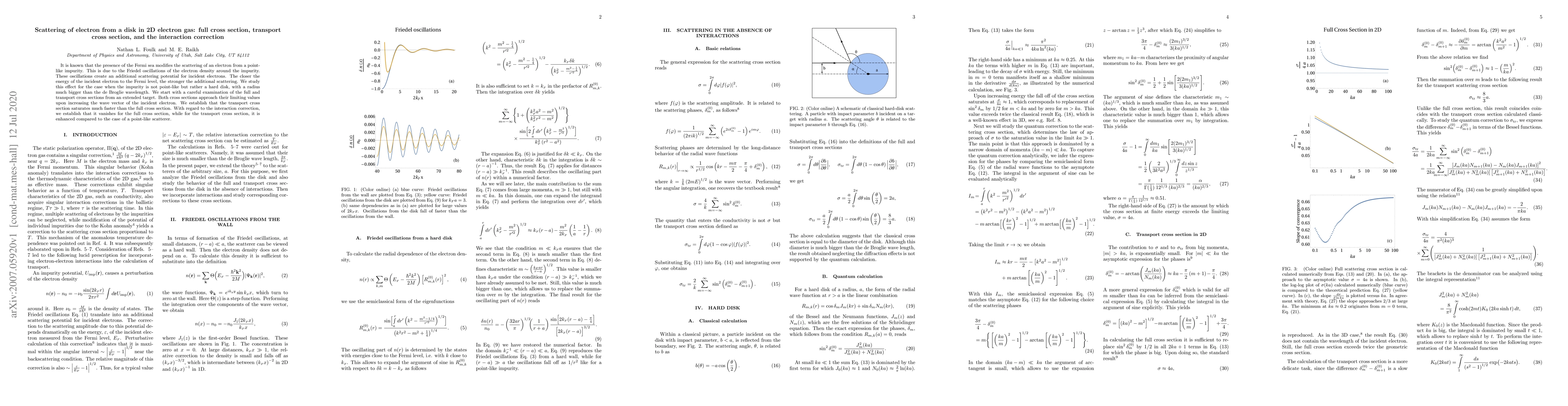 This paper investigates the scattering of electrons from a hard disk impurity in a 2D electron gas, focusing on the full and transport cross sections and interaction corrections. It finds that the transport cross section saturates faster and the interaction correction is enhanced compared to point-like scatterers.
