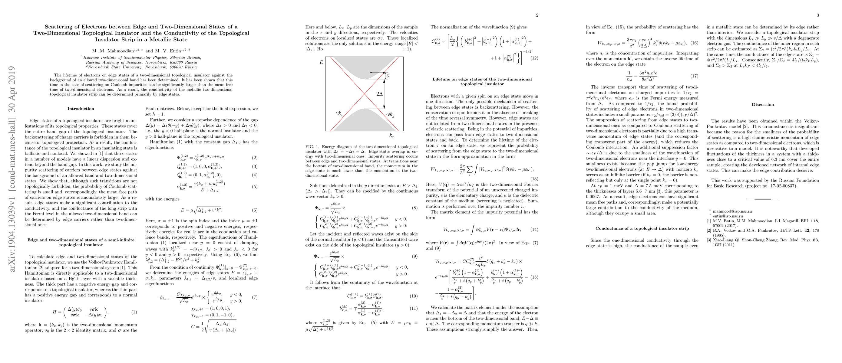 Summary: This research examines electron scattering between edge and two-dimensional states in a two-dimensional topological insulator, revealing that edge states have significantly longer lifetimes against Coulomb impurity scattering than two-dimensional electrons, thereby dominating the metallic strip's conductivity.