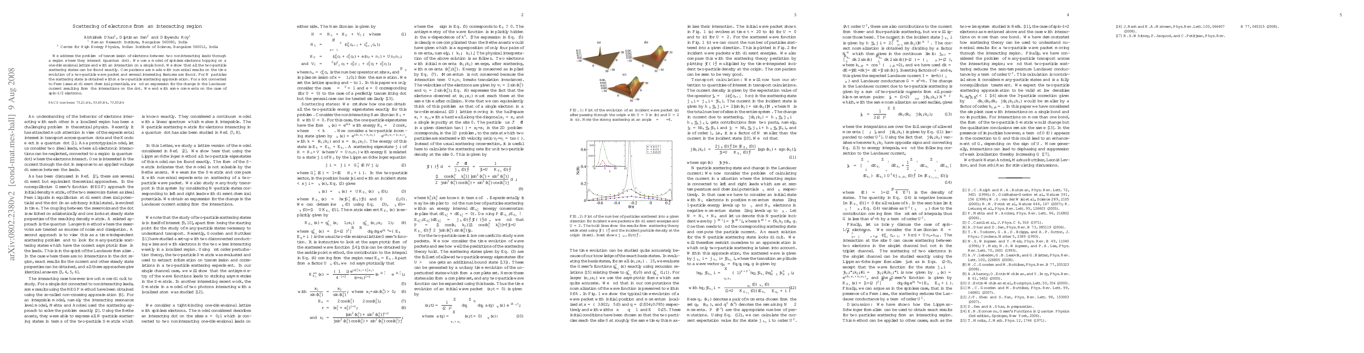 We address the problem of transmission of electrons between two noninteracting leads through a region where they interact (quantum dot). We use a model of spinless electrons hopping on a one-dimensional lattice and with an interaction on a single bond. We show that all the two-particle scattering states can be found exactly. Comparisons are made with numerical results on the time evolution of a two-particle wave packet and several interesting features are found for scattering. For N particles the scattering state is obtained by perturbation theory. For a dot connected to Fermi seas at different chemical potentials, we find an expression for the change in the Landauer current resulting from the interactions on the dot. We end with some comments on the case of spin-1/2 electrons.