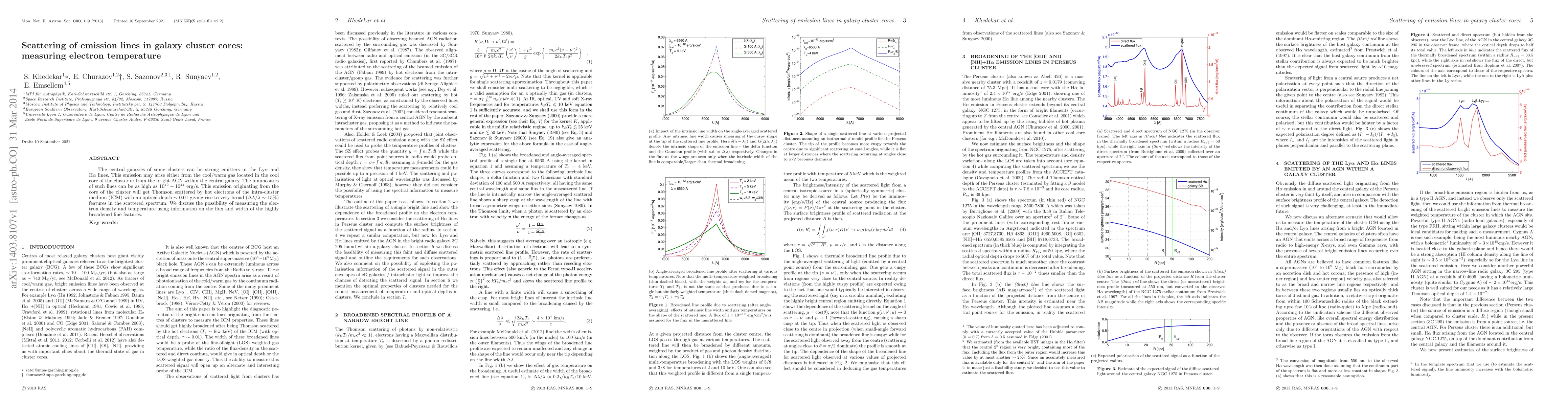 The central galaxies of some clusters can be strong emitters in the Ly$\alpha$ and H$\alpha$ lines. This emission may arise either from the cool/warm gas located in the cool core of the cluster or from the bright AGN within the central galaxy. The luminosities of such lines can be as high as $10^{42} - 10^{44}$ erg/s. This emission originating from the core of the cluster will get Thomson scattered by hot electrons of the intra-cluster medium (ICM) with an optical depth $\sim$ 0.01 giving rise to very broad ($\Delta \lambda / \lambda \sim$ 15%) features in the scattered spectrum. We discuss the possibility of measuring the electron density and temperature using information on the flux and width of the highly broadened line features.