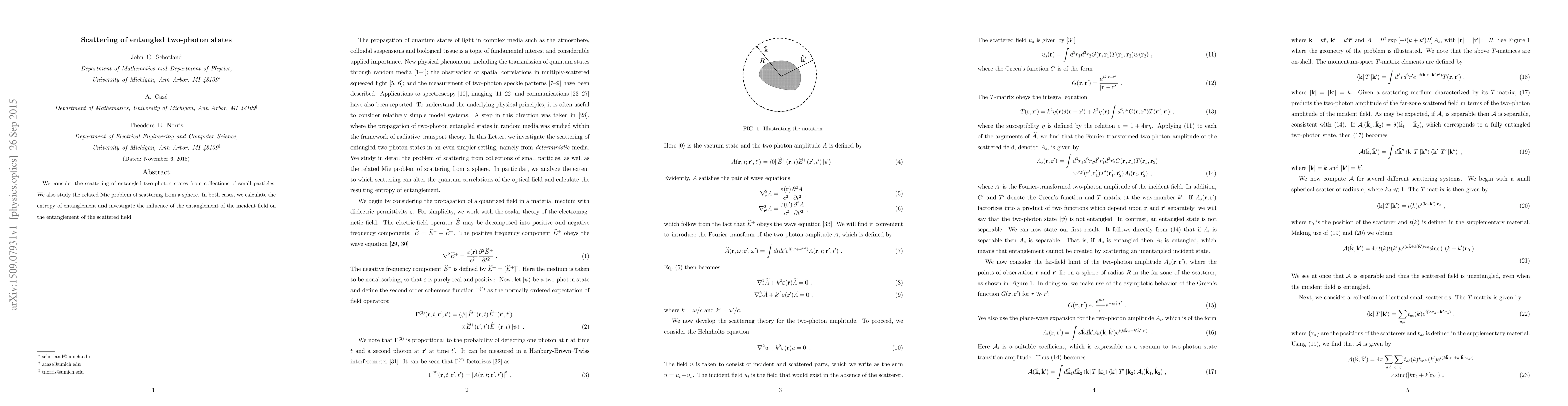 We consider the scattering of entangled two-photon states from collections of small particles. We also study the related Mie problem of scattering from a sphere. In both cases, we calculate the entropy of entanglement and investigate the influence of the entanglement of the incident field on the entanglement of the scattered field.