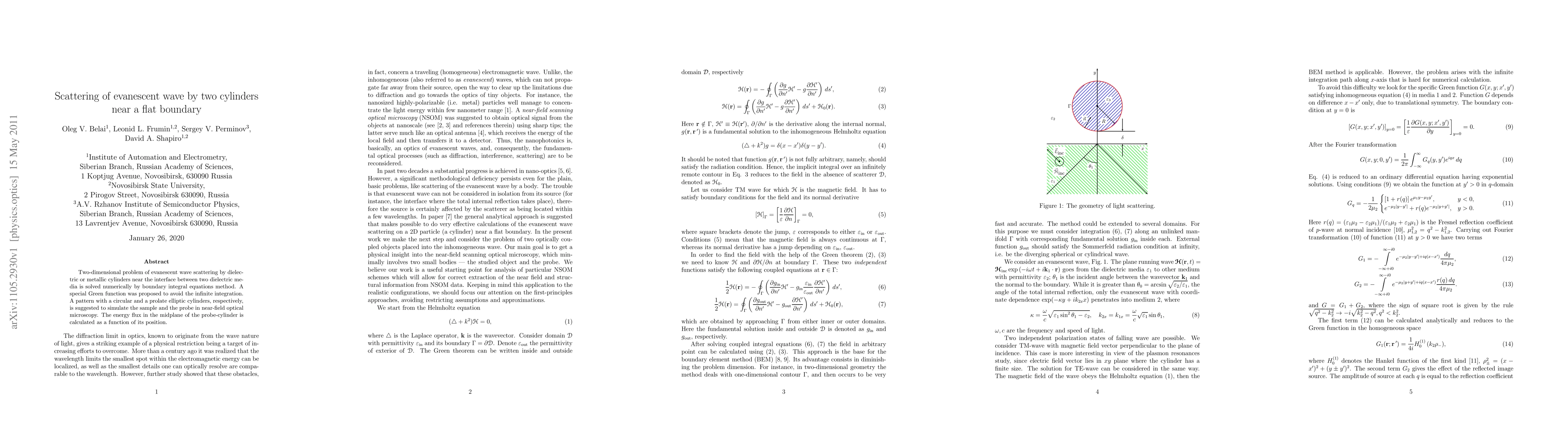 Two-dimensional problem of evanescent wave scattering by dielectric or metallic cylinders near the interface between two dielectric media is solved numerically by boundary integral equations method. A special Green function was proposed to avoid the infinite integration. A pattern with a circular and a prolate elliptic cylinders, respectively, is suggested to simulate the sample and the probe in near-field optical microscopy. The energy flux in the midplane of the probe-cylinder is calculated as a function of its position.