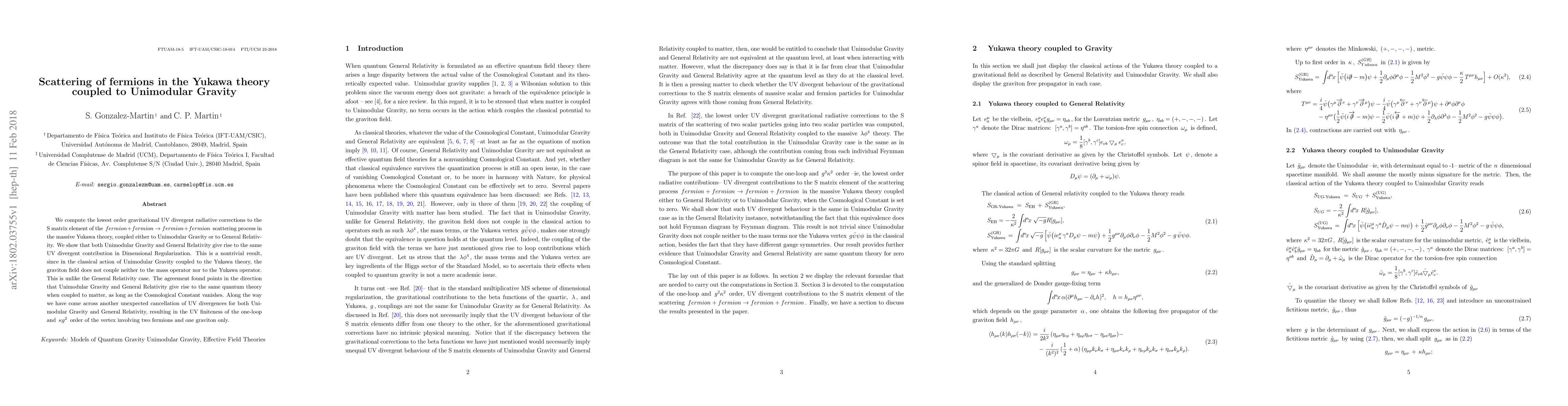 This paper investigates the lowest order gravitational UV divergent corrections in the Yukawa theory coupled to Unimodular Gravity and General Relativity, finding that both theories yield identical UV divergent contributions. An unexpected cancellation of UV divergences results in the UV finiteness of specific one-loop processes.