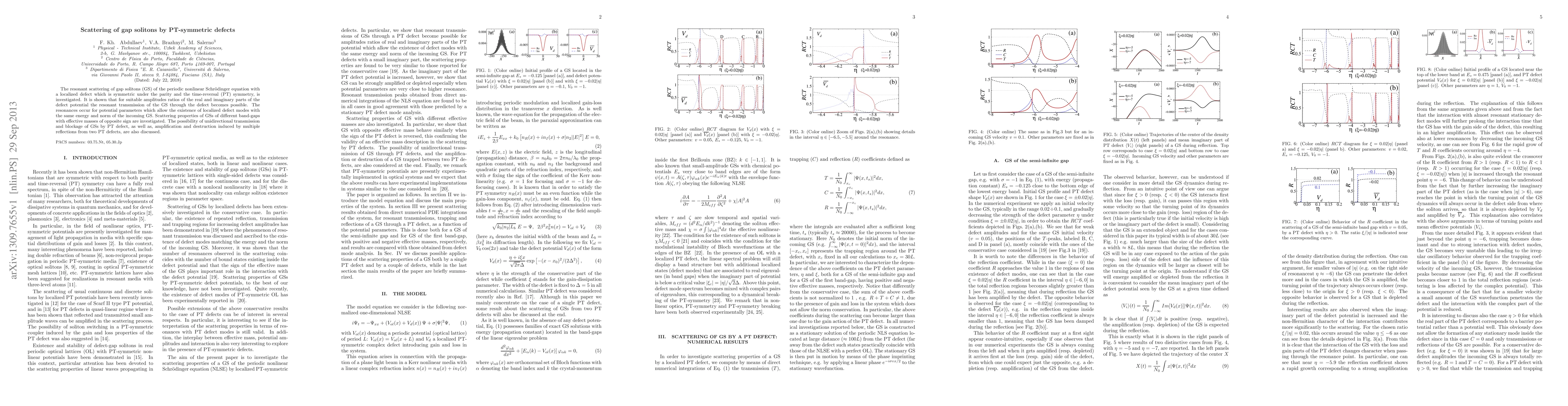 This paper investigates the scattering of gap solitons by PT-symmetric defects in the periodic nonlinear Schrödinger equation. It demonstrates that resonant transmission of gap solitons through the defect is possible under specific conditions, revealing potential for unidirectional transmission, blockage, amplification, and destruction via multiple reflections.