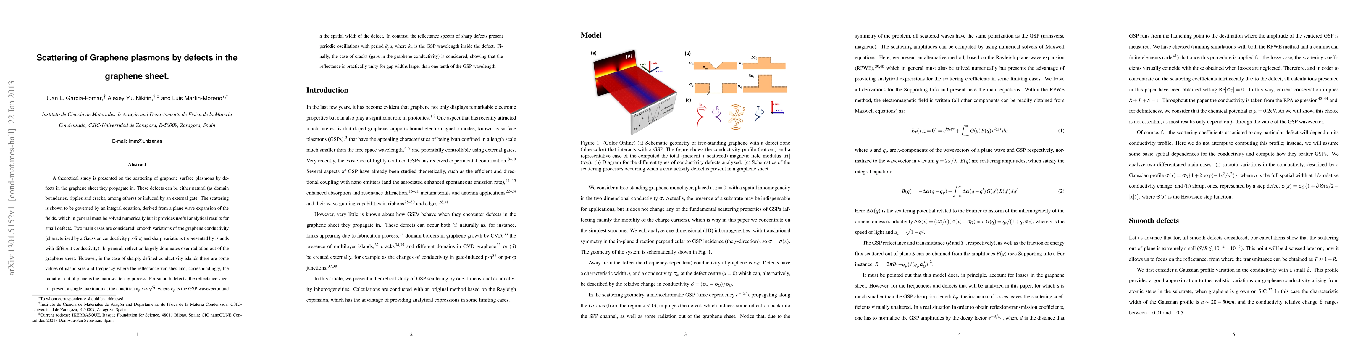 A theoretical study is presented on the scattering of graphene surface plasmons by defects in the graphene sheet they propagate in. These defects can be either natural (as domain boundaries, ripples and cracks, among others) or induced by an external gate. The scattering is shown to be governed by an integral equation, derived from a plane wave expansion of the fields, which in general must be solved numerically but it provides useful analytical results for small defects. Two main cases are considered: smooth variations of the graphene conductivity (characterized by a Gaussian conductivity profile) and sharp variations (represented by islands with different conductivity). In general, reflection largely dominates over radiation out of the graphene sheet. However, in the case of sharply defined conductivity islands there are some values of island size and frequency where the reflectance vanishes and, correspondingly, the radiation out of plane is the main scattering process. For smooth defects, the reflectance spectra present a single maximum at the condition $k_p a \approx \sqrt{2}$, where $k_p$ is the GSP wavevector and $a$ the spatial width of the defect. In contrast, the reflectance spectra of sharp defects present periodic oscillations with period $k_p' a$, where $k_p'$ is the GSP wavelength inside the defect. Finally, the case of cracks (gaps in the graphene conductivity) is considered, showing that the reflectance is practically unity for gap widths larger than one tenth of the GSP wavelength.