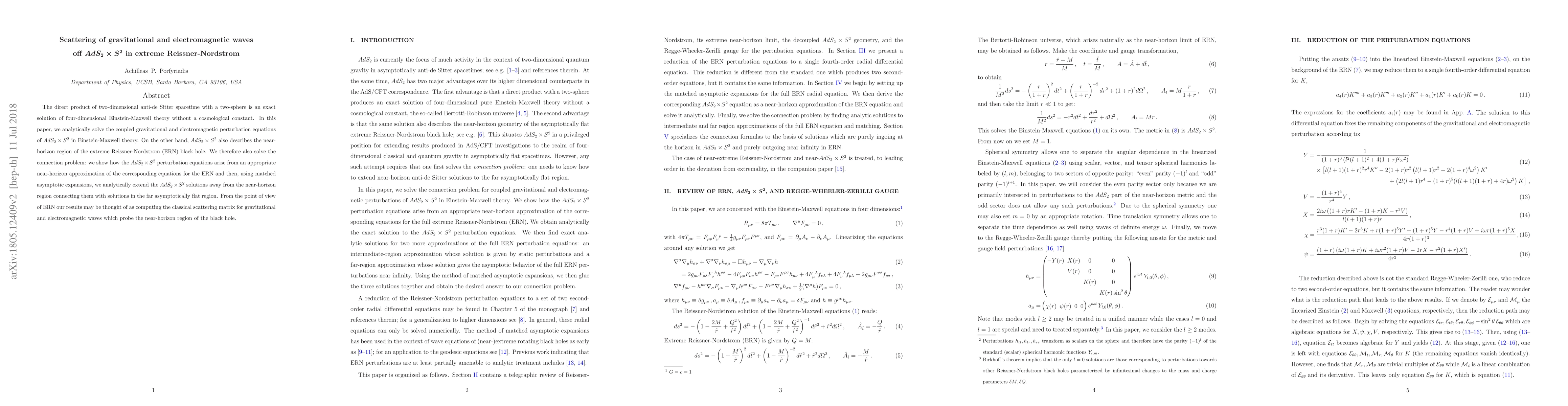 The direct product of two-dimensional anti-de Sitter spacetime with a two-sphere is an exact solution of four-dimensional Einstein-Maxwell theory without a cosmological constant. In this paper, we analytically solve the coupled gravitational and electromagnetic perturbation equations of $AdS_2\times S^2$ in Einstein-Maxwell theory. On the other hand, $AdS_2\times S^2$ also describes the near-horizon region of the extreme Reissner-Nordstrom (ERN) black hole. We therefore also solve the connection problem: we show how the $AdS_2\times S^2$ perturbation equations arise from an appropriate near-horizon approximation of the corresponding equations for the ERN and then, using matched asymptotic expansions, we analytically extend the $AdS_2\times S^2$ solutions away from the near-horizon region connecting them with solutions in the far asymptotically flat region. From the point of view of ERN our results may be thought of as computing the classical scattering matrix for gravitational and electromagnetic waves which probe the near-horizon region of the black hole.